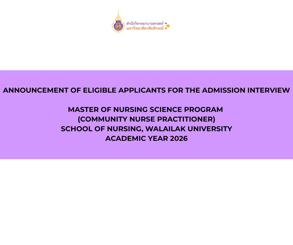 Announcement of Eligible Applicants for the Admission Interview Master of Nursing Science Program (Community Nurse Practitioner)School of Nursing, Walailak UniversityAcademic Year 2026 The School of Nursing, Walailak University, is pleased to announce the list of applicants who have been deemed eligible to attend the admission interview for the Master of Nursing Science Program (Community Nurse […]