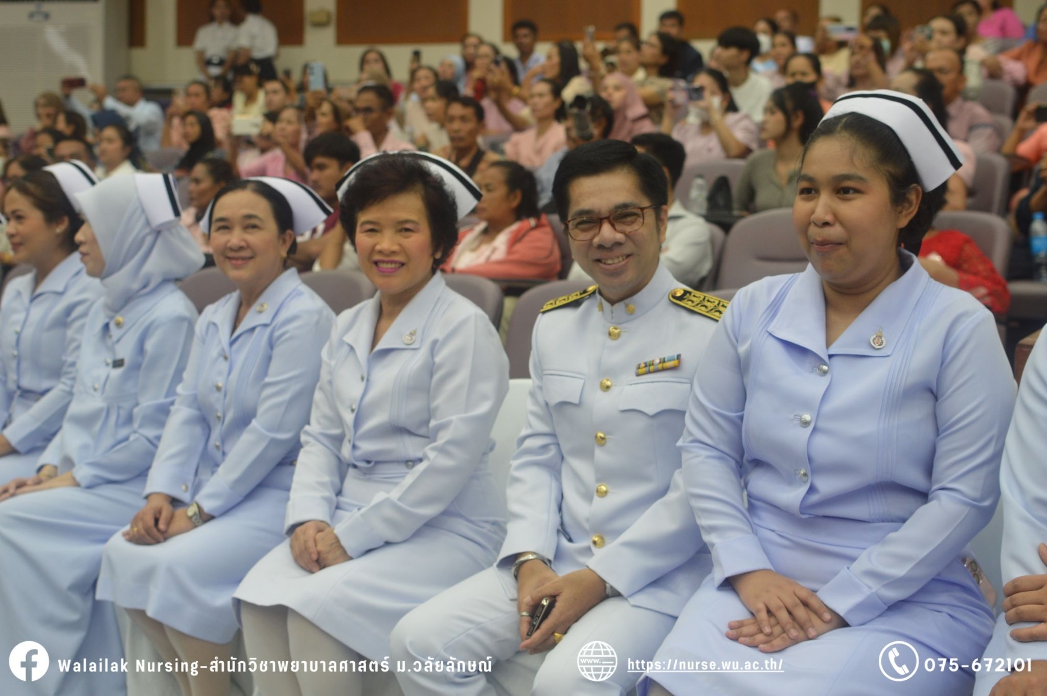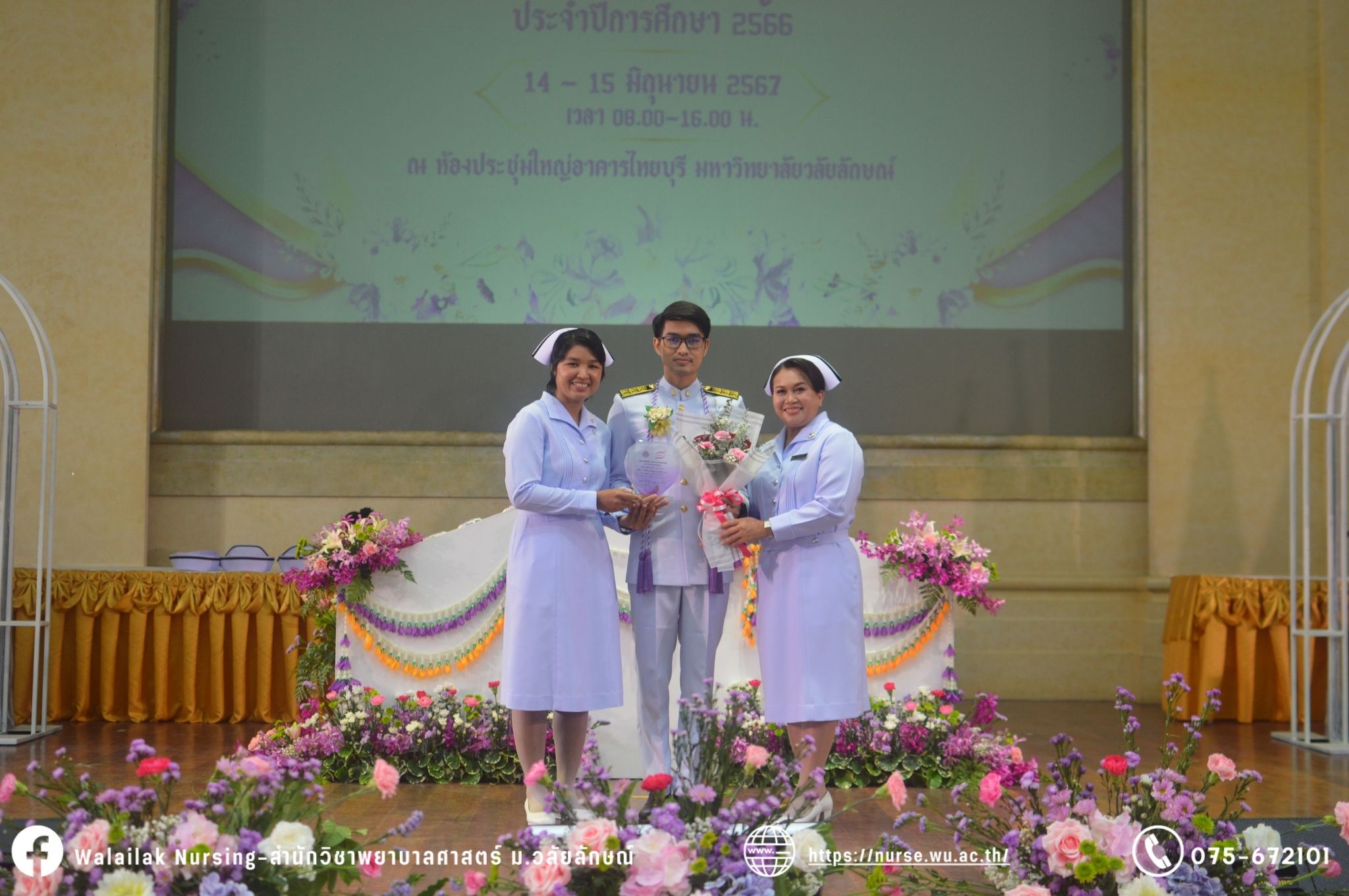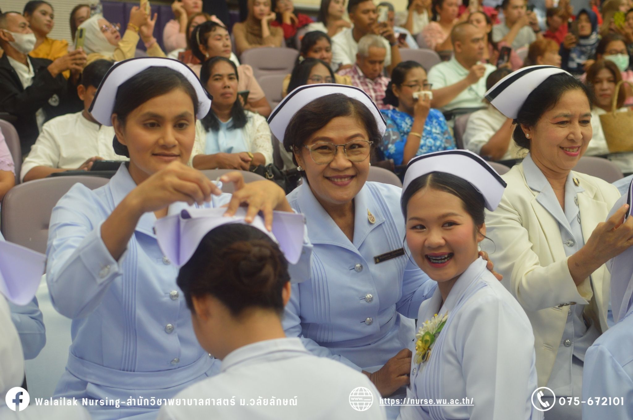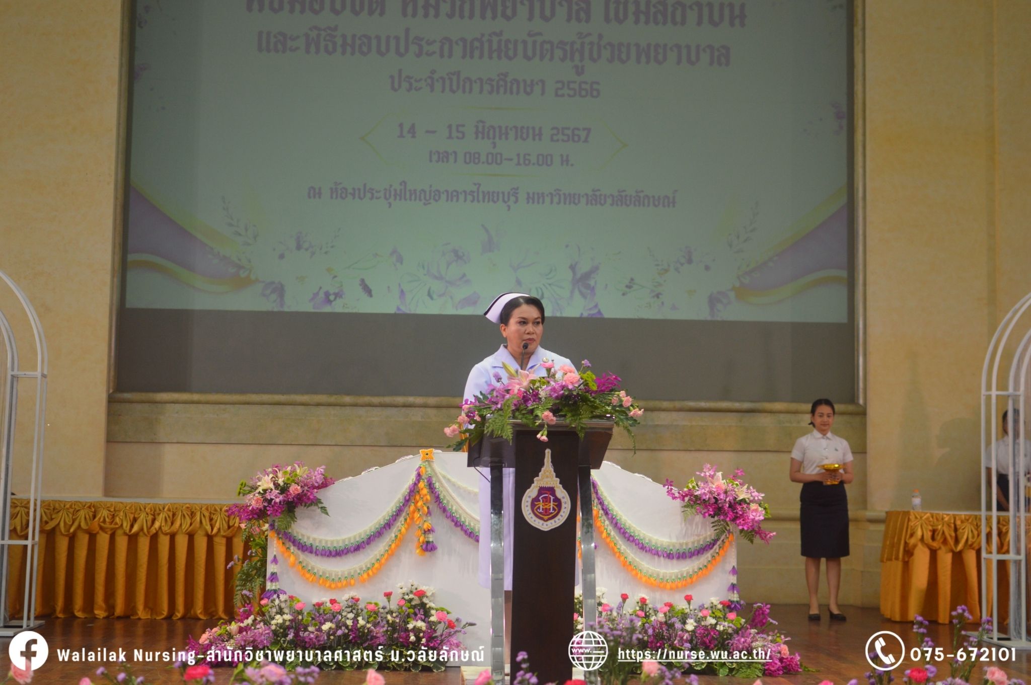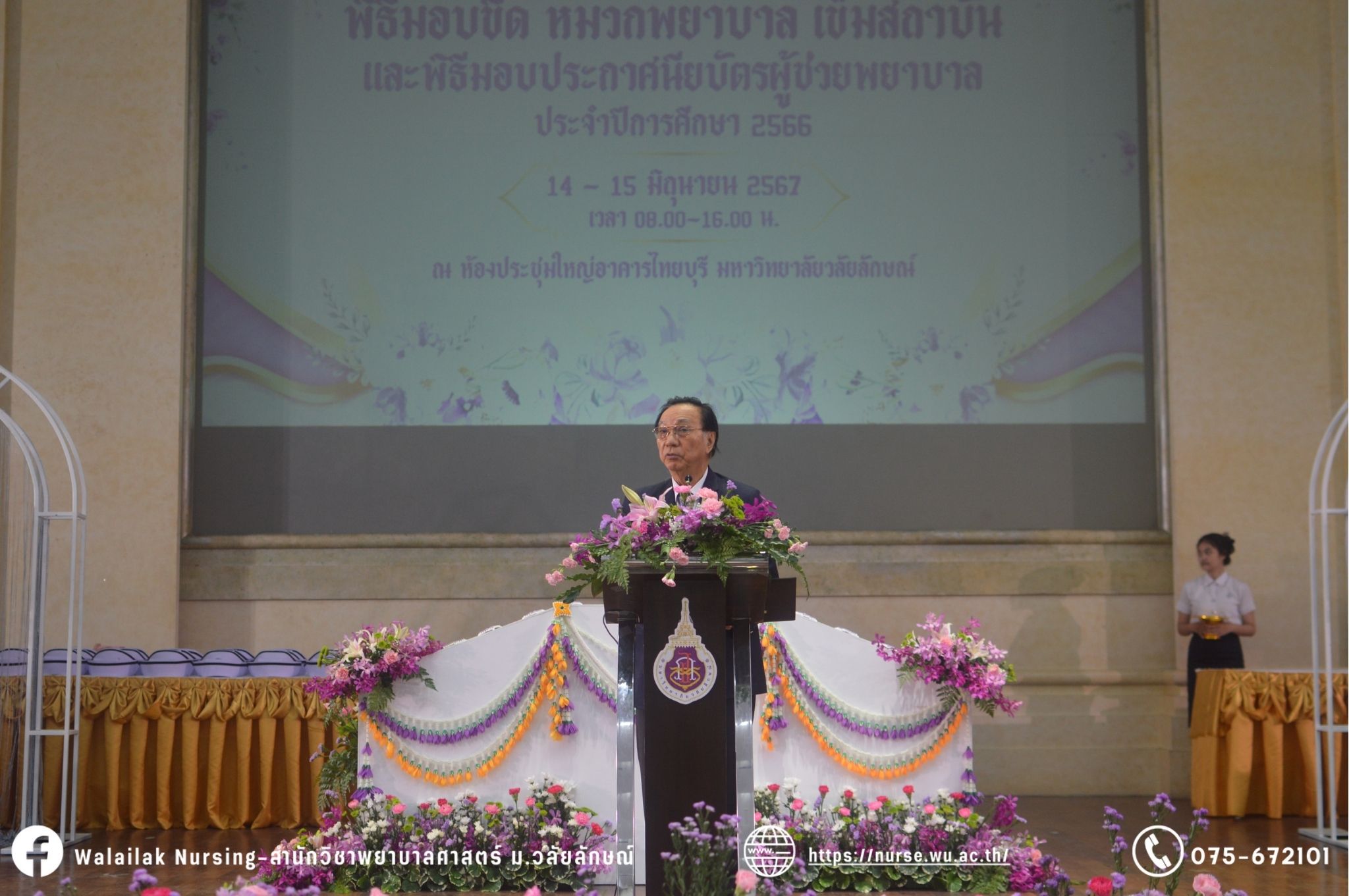 เมื่อวันที่ 15 มิถุนายน 2567 สำนักวิชาพยาบาลศาสตร์ มหาวิทยาลัยวลัยลักษณ์ จัดพิธี มอบขีด หมวกพยาบาล เข็มสถาบัน และพิธีมอบประกาศนียบัตรผู้ช่วยพยาบาล ณ หอประชุมใหญ่ อาคารไทยบุรี โดยกิจกรรมในครั้งนี้ ผู้ช่วยศาสตราจารย์ ดร.อรเพ็ญ สุขะวัลลิ คณบดีสำนักวิชาพยาบาลศาสตร์เป็นประธานในพิธี อาจารย์สุดา ใจห้าว รองคณบดีสำนักวิชาพยาบาลศาสตร์ กล่าวรายงานโครงการ และกิจกรรมในครั้งนี้ได้รับเกียรติจาก ศาสตราจารย์ ดร.สมบัติ ธำรงธัญวงศ์ อธิการบดี มหาวิทยาลัยวลัยลักษณ์ ได้เข้าร่วมพิธี กล่าวต้อนรับผู้ปกครองและให้โอวาท แสดงความยินดีกับผู้สำเร็จการศึกษา นักศึกษาที่ได้รับหมวก ขีดหมวก เข็มสถาบัน และผู้ได้รับรางวัล สำหรับการจัดกิจกรรมในครั้งนี้ได้จัดขึ้นเพื่อแสดงความยินดีให้กับบัณฑิตหลักสูตรพยาบาลศาสตรบัณฑิต ที่สำเร็จการศึกษา นักศึกษาพยาบาลชั้นปีที่ 3 มหาบัณฑิต หลักสูตรพยาบาลศาสตรมหาบัณฑิต ผู้สำเร็จการศึกษาหลักสูตรประกาศนียบัตรผู้ช่วยพยาบาล และผู้ได้รับรางวัลและเกียรติบัตรในการเป็นตัวอย่างที่ดีทั้งด้านการเรียนการปฏิบัติงาน จิตอาสา และบำเพ็ญประโยชน์เพื่อส่วนรวม รวมถึงผู้ได้รับรางวัลศิษย์เก่าดีเด่น จากสมาคมศิษย์เก่าพยาบาลวลัยลักษณ์ ทั้งนี้เพื่อเป็นการสร้างสัมพันธภาพที่ดีระหว่างรุ่นพี่ รุ่นน้อง และสร้างเจตคติที่ดีต่อวิชาชีพ พร้อมเข้าสู่วิชาชีพพยาบาลทั้งในด้านวิชาการ วิชาชีพ