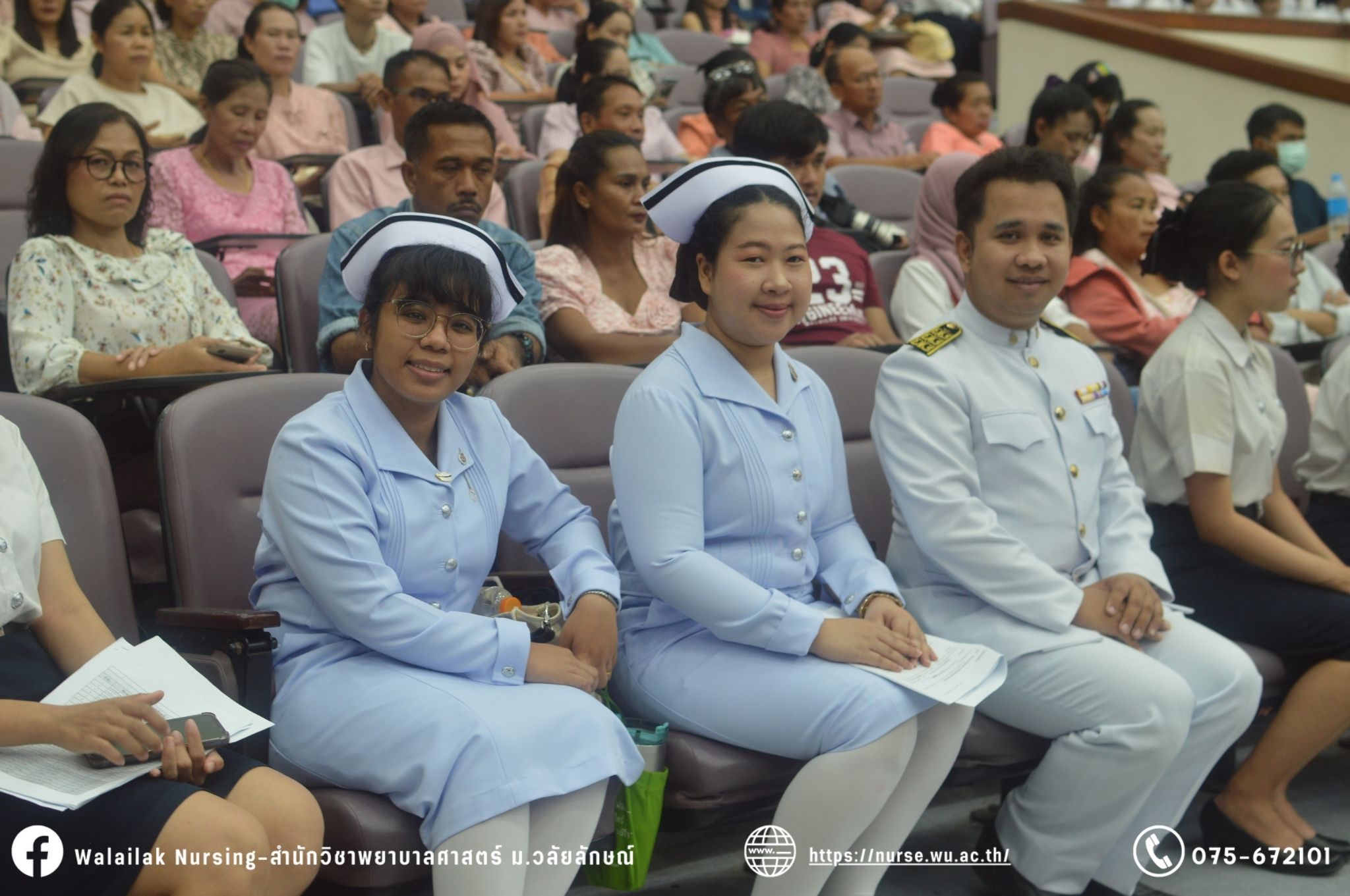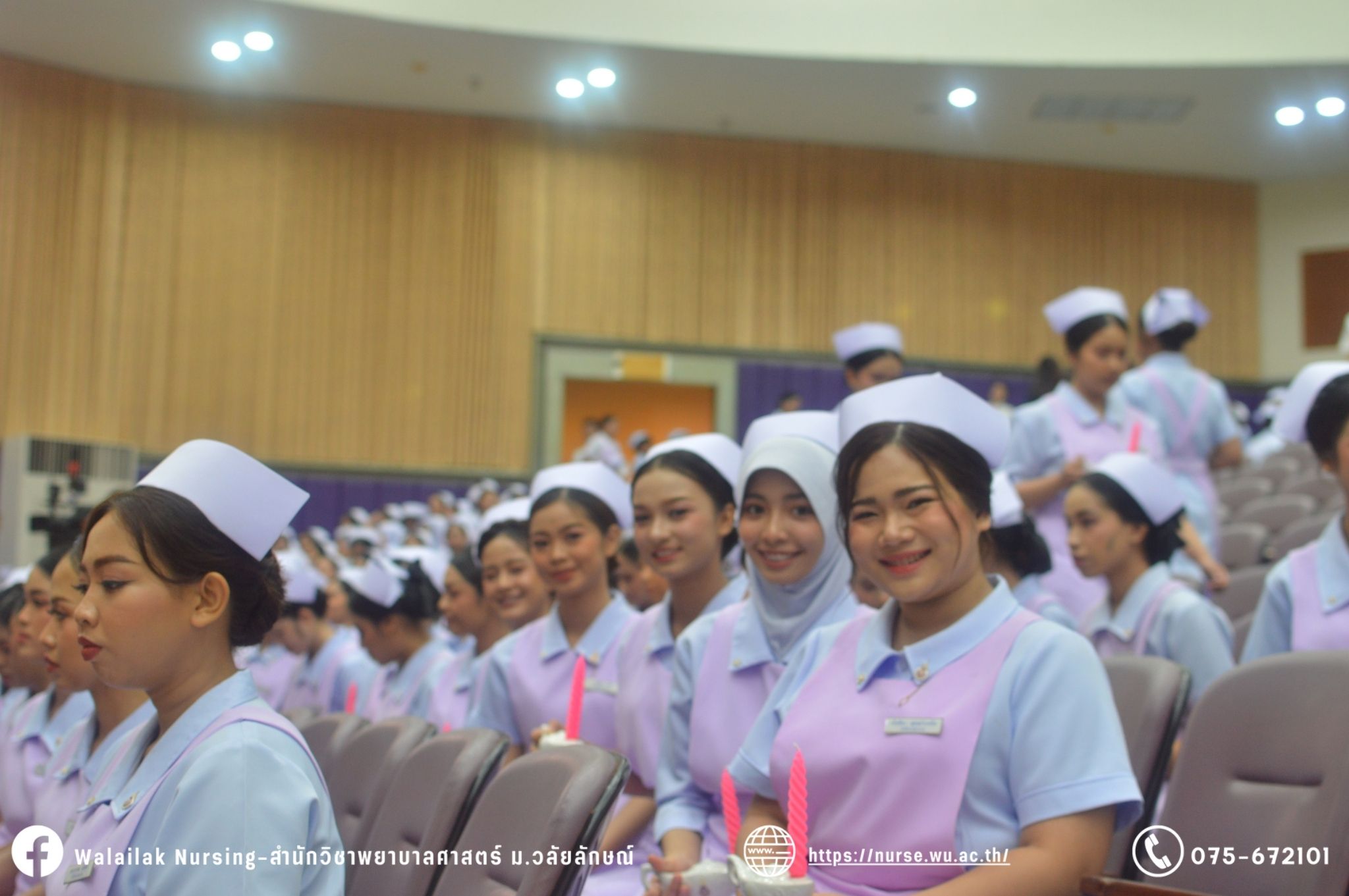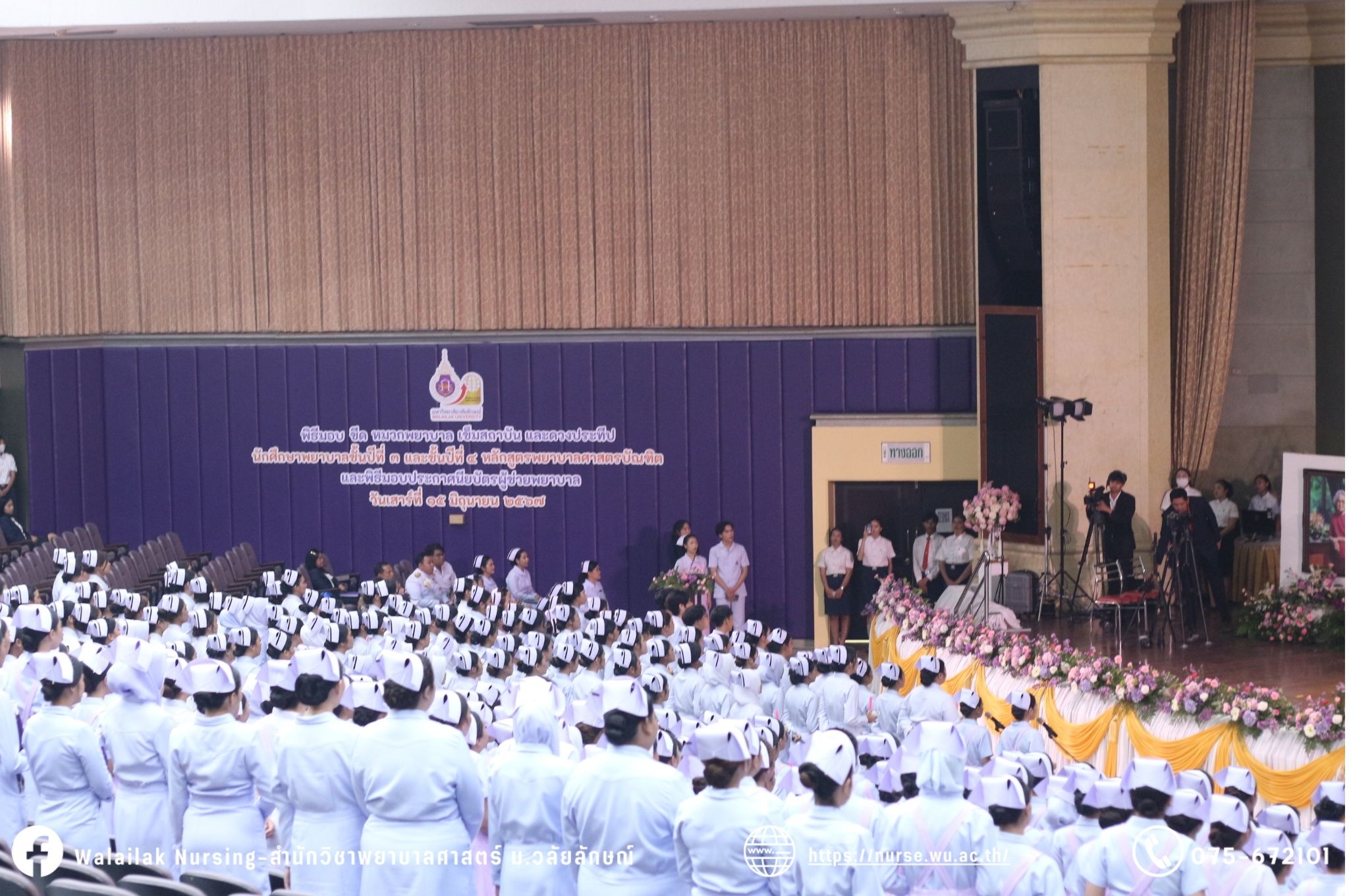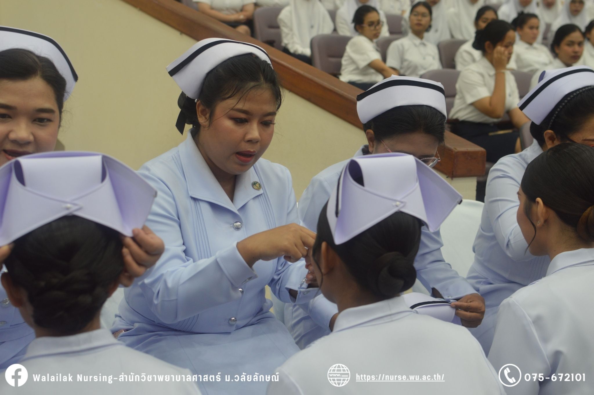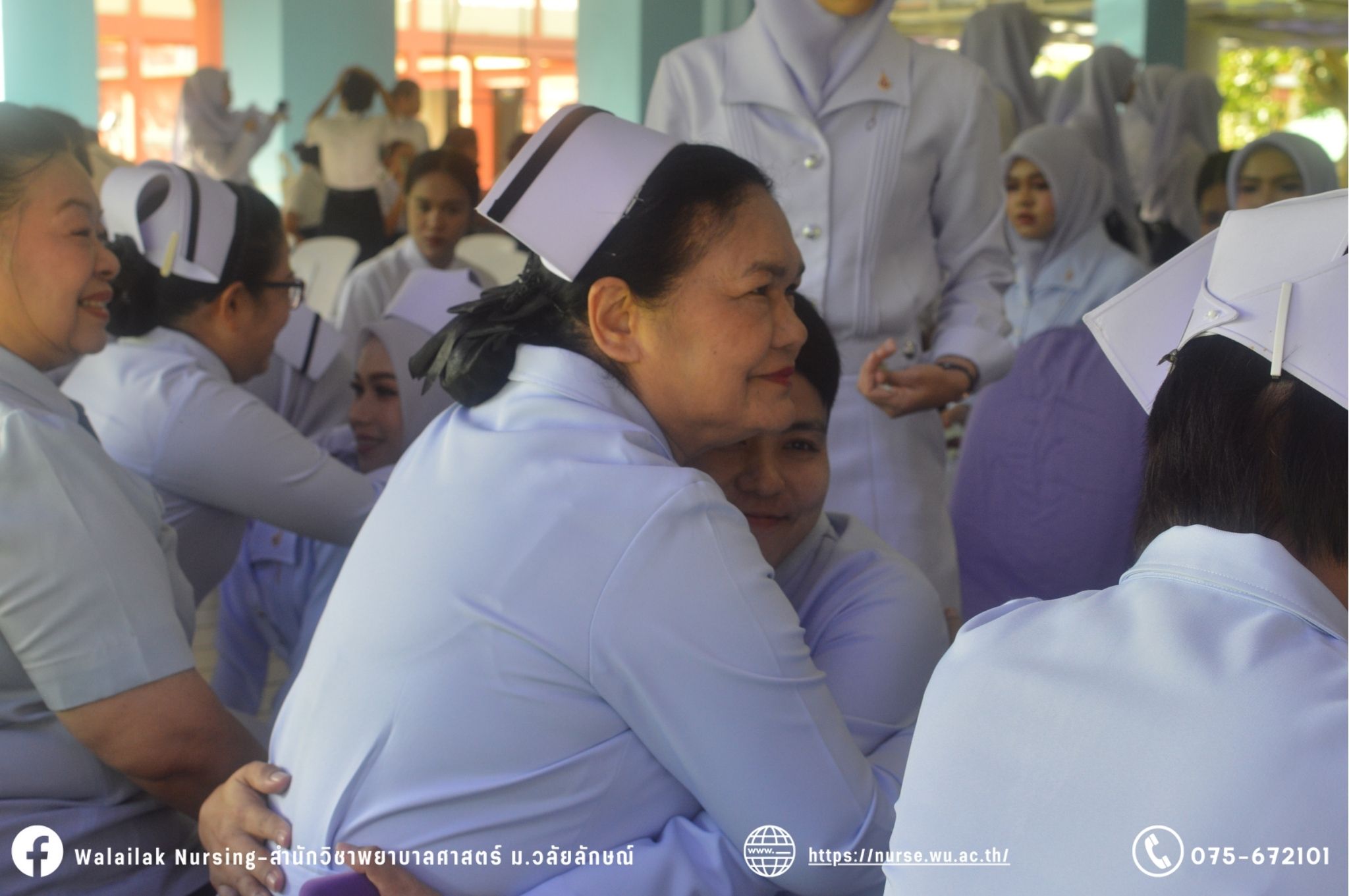 เมื่อวันที่ 15 มิถุนายน 2567 สำนักวิชาพยาบาลศาสตร์ มหาวิทยาลัยวลัยลักษณ์ จัดพิธี มอบขีด หมวกพยาบาล เข็มสถาบัน และพิธีมอบประกาศนียบัตรผู้ช่วยพยาบาล ณ หอประชุมใหญ่ อาคารไทยบุรี โดยกิจกรรมในครั้งนี้ ผู้ช่วยศาสตราจารย์ ดร.อรเพ็ญ สุขะวัลลิ คณบดีสำนักวิชาพยาบาลศาสตร์เป็นประธานในพิธี อาจารย์สุดา ใจห้าว รองคณบดีสำนักวิชาพยาบาลศาสตร์ กล่าวรายงานโครงการ และกิจกรรมในครั้งนี้ได้รับเกียรติจาก ศาสตราจารย์ ดร.สมบัติ ธำรงธัญวงศ์ อธิการบดี มหาวิทยาลัยวลัยลักษณ์ ได้เข้าร่วมพิธี กล่าวต้อนรับผู้ปกครองและให้โอวาท แสดงความยินดีกับผู้สำเร็จการศึกษา นักศึกษาที่ได้รับหมวก ขีดหมวก เข็มสถาบัน และผู้ได้รับรางวัล สำหรับการจัดกิจกรรมในครั้งนี้ได้จัดขึ้นเพื่อแสดงความยินดีให้กับบัณฑิตหลักสูตรพยาบาลศาสตรบัณฑิต ที่สำเร็จการศึกษา นักศึกษาพยาบาลชั้นปีที่ 3 มหาบัณฑิต หลักสูตรพยาบาลศาสตรมหาบัณฑิต ผู้สำเร็จการศึกษาหลักสูตรประกาศนียบัตรผู้ช่วยพยาบาล และผู้ได้รับรางวัลและเกียรติบัตรในการเป็นตัวอย่างที่ดีทั้งด้านการเรียนการปฏิบัติงาน จิตอาสา และบำเพ็ญประโยชน์เพื่อส่วนรวม รวมถึงผู้ได้รับรางวัลศิษย์เก่าดีเด่น จากสมาคมศิษย์เก่าพยาบาลวลัยลักษณ์ ทั้งนี้เพื่อเป็นการสร้างสัมพันธภาพที่ดีระหว่างรุ่นพี่ รุ่นน้อง และสร้างเจตคติที่ดีต่อวิชาชีพ พร้อมเข้าสู่วิชาชีพพยาบาลทั้งในด้านวิชาการ วิชาชีพ