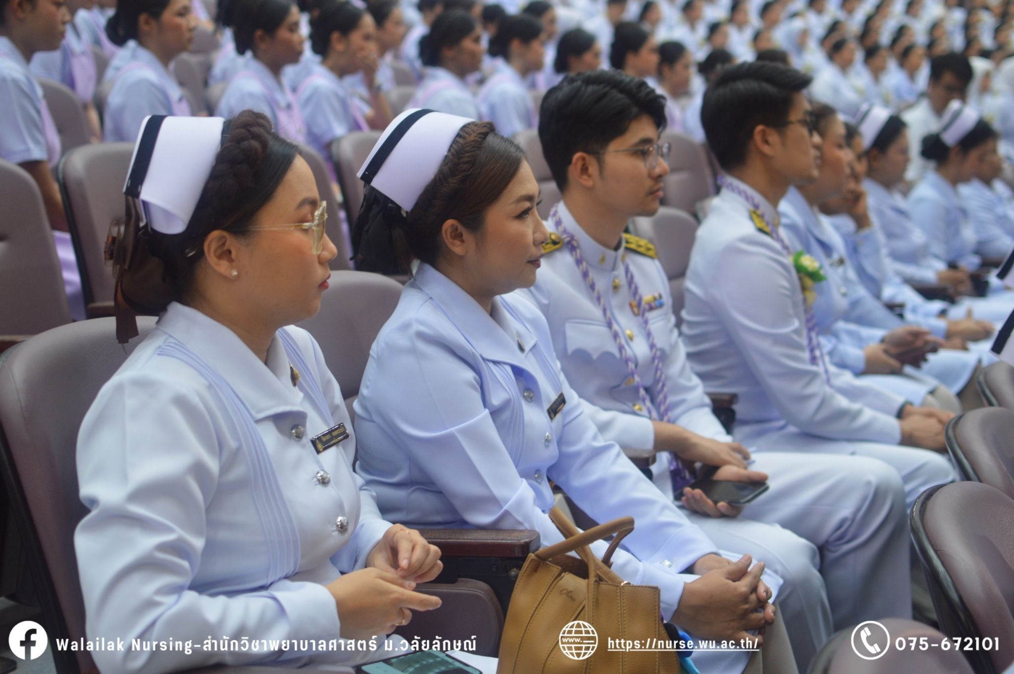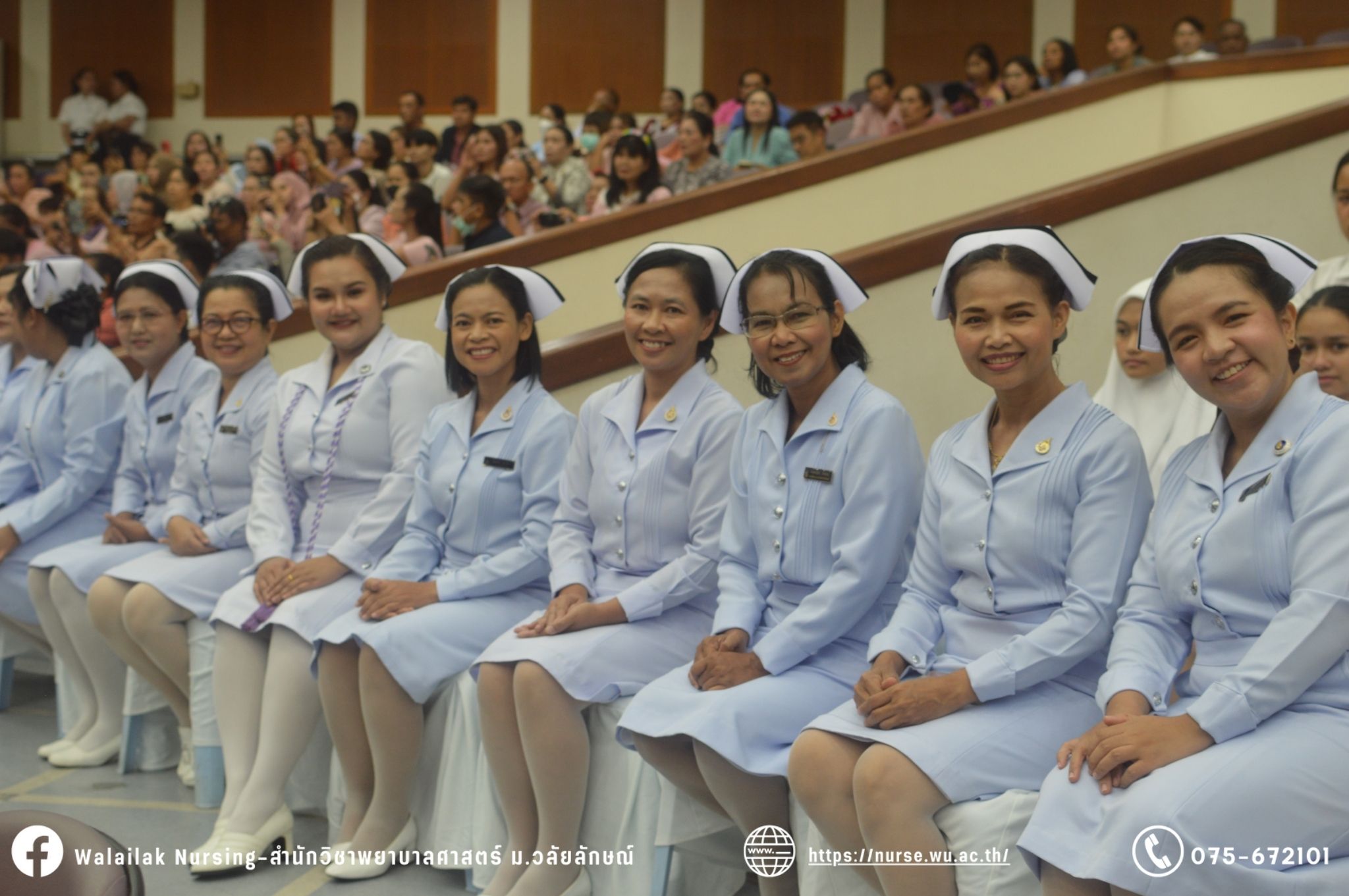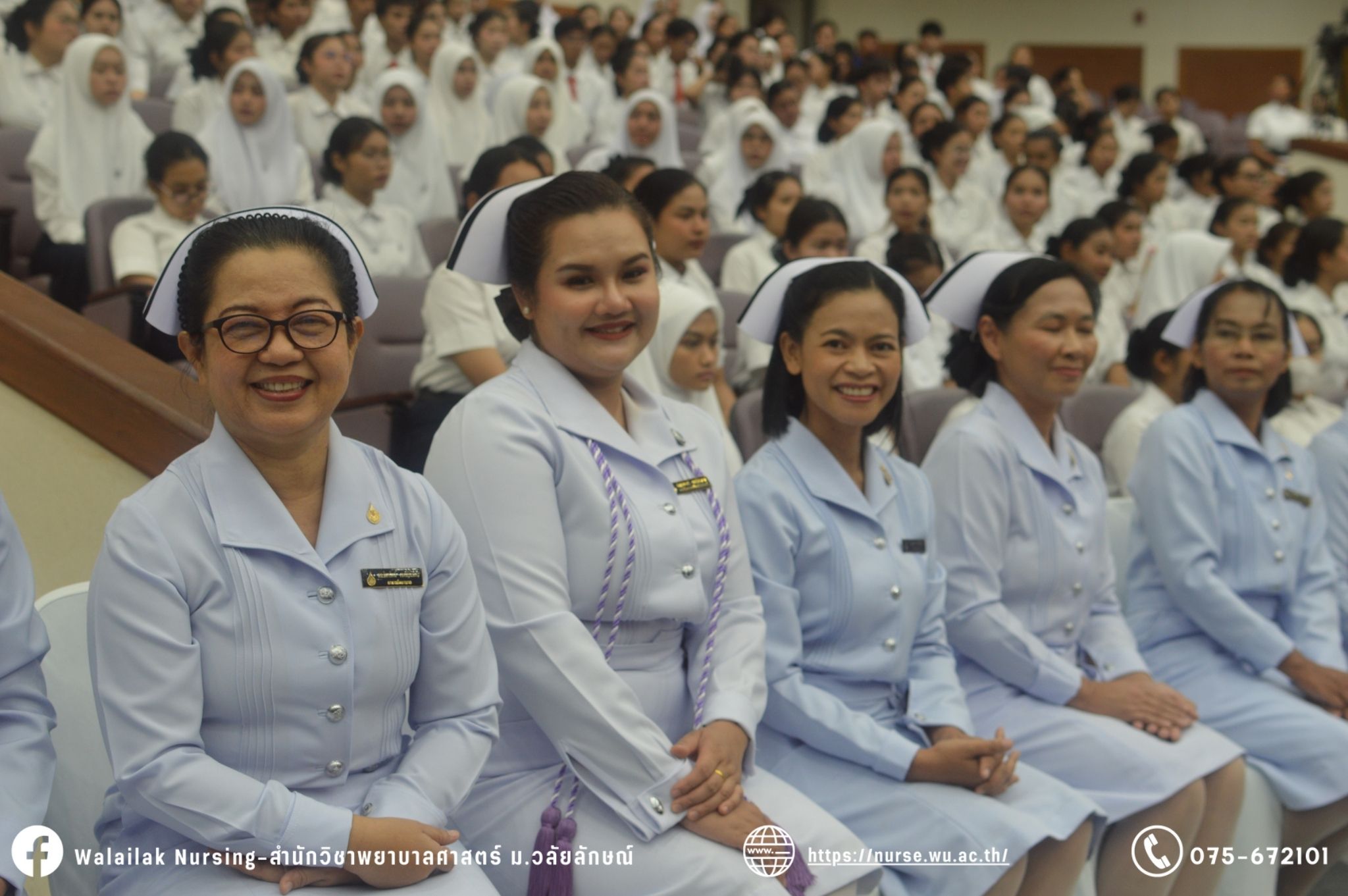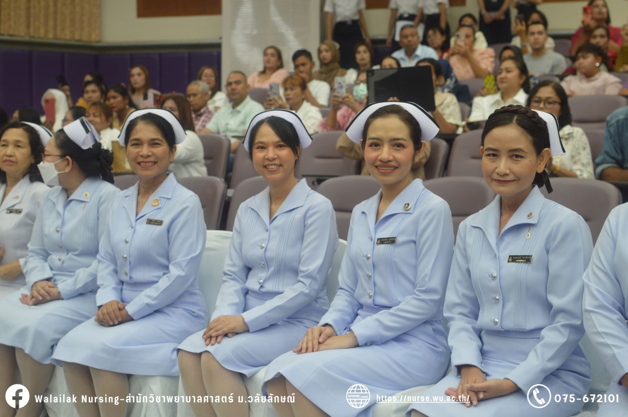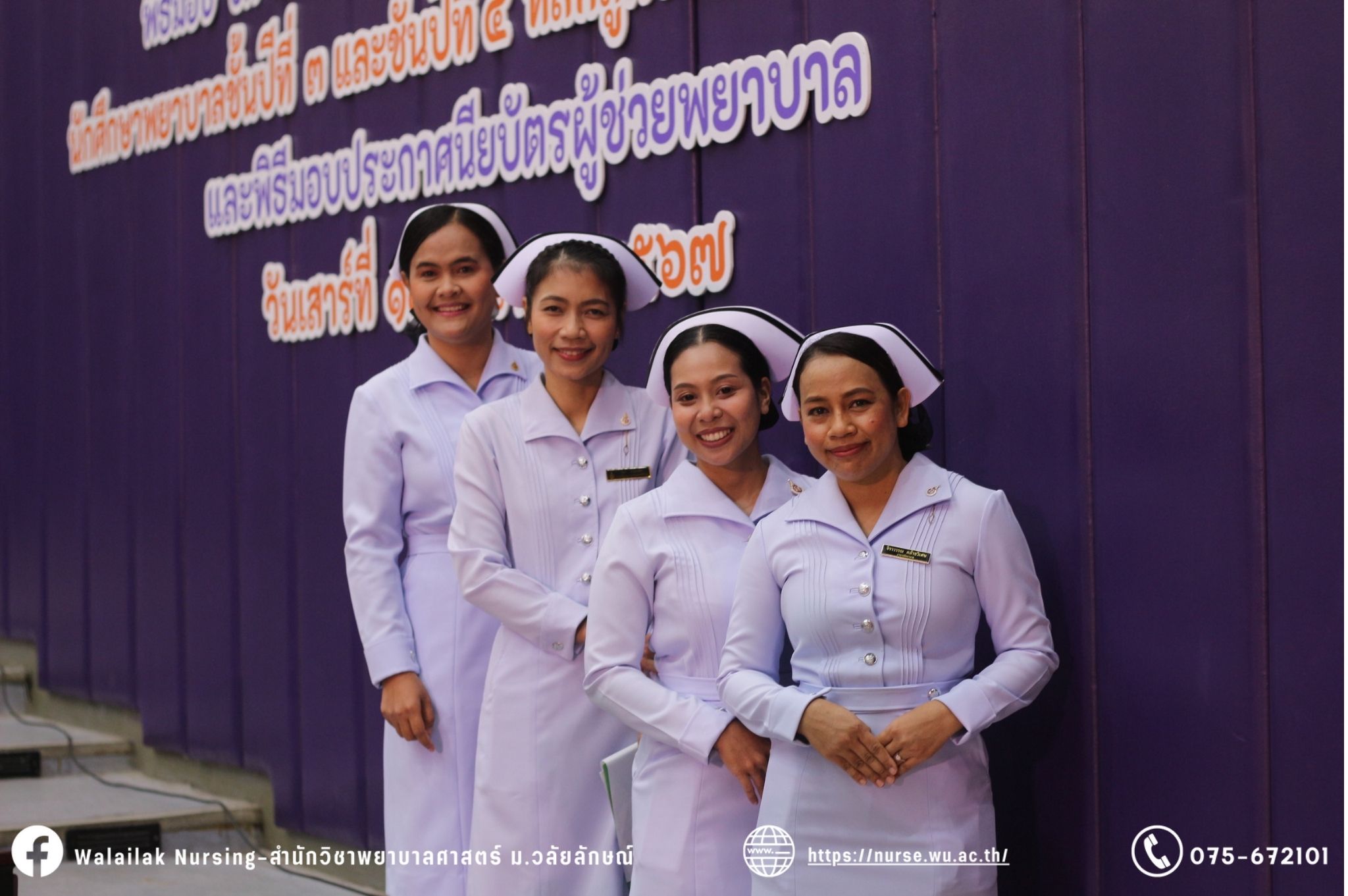 เมื่อวันที่ 15 มิถุนายน 2567 สำนักวิชาพยาบาลศาสตร์ มหาวิทยาลัยวลัยลักษณ์ จัดพิธี มอบขีด หมวกพยาบาล เข็มสถาบัน และพิธีมอบประกาศนียบัตรผู้ช่วยพยาบาล ณ หอประชุมใหญ่ อาคารไทยบุรี โดยกิจกรรมในครั้งนี้ ผู้ช่วยศาสตราจารย์ ดร.อรเพ็ญ สุขะวัลลิ คณบดีสำนักวิชาพยาบาลศาสตร์เป็นประธานในพิธี อาจารย์สุดา ใจห้าว รองคณบดีสำนักวิชาพยาบาลศาสตร์ กล่าวรายงานโครงการ และกิจกรรมในครั้งนี้ได้รับเกียรติจาก ศาสตราจารย์ ดร.สมบัติ ธำรงธัญวงศ์ อธิการบดี มหาวิทยาลัยวลัยลักษณ์ ได้เข้าร่วมพิธี กล่าวต้อนรับผู้ปกครองและให้โอวาท แสดงความยินดีกับผู้สำเร็จการศึกษา นักศึกษาที่ได้รับหมวก ขีดหมวก เข็มสถาบัน และผู้ได้รับรางวัล สำหรับการจัดกิจกรรมในครั้งนี้ได้จัดขึ้นเพื่อแสดงความยินดีให้กับบัณฑิตหลักสูตรพยาบาลศาสตรบัณฑิต ที่สำเร็จการศึกษา นักศึกษาพยาบาลชั้นปีที่ 3 มหาบัณฑิต หลักสูตรพยาบาลศาสตรมหาบัณฑิต ผู้สำเร็จการศึกษาหลักสูตรประกาศนียบัตรผู้ช่วยพยาบาล และผู้ได้รับรางวัลและเกียรติบัตรในการเป็นตัวอย่างที่ดีทั้งด้านการเรียนการปฏิบัติงาน จิตอาสา และบำเพ็ญประโยชน์เพื่อส่วนรวม รวมถึงผู้ได้รับรางวัลศิษย์เก่าดีเด่น จากสมาคมศิษย์เก่าพยาบาลวลัยลักษณ์ ทั้งนี้เพื่อเป็นการสร้างสัมพันธภาพที่ดีระหว่างรุ่นพี่ รุ่นน้อง และสร้างเจตคติที่ดีต่อวิชาชีพ พร้อมเข้าสู่วิชาชีพพยาบาลทั้งในด้านวิชาการ วิชาชีพ