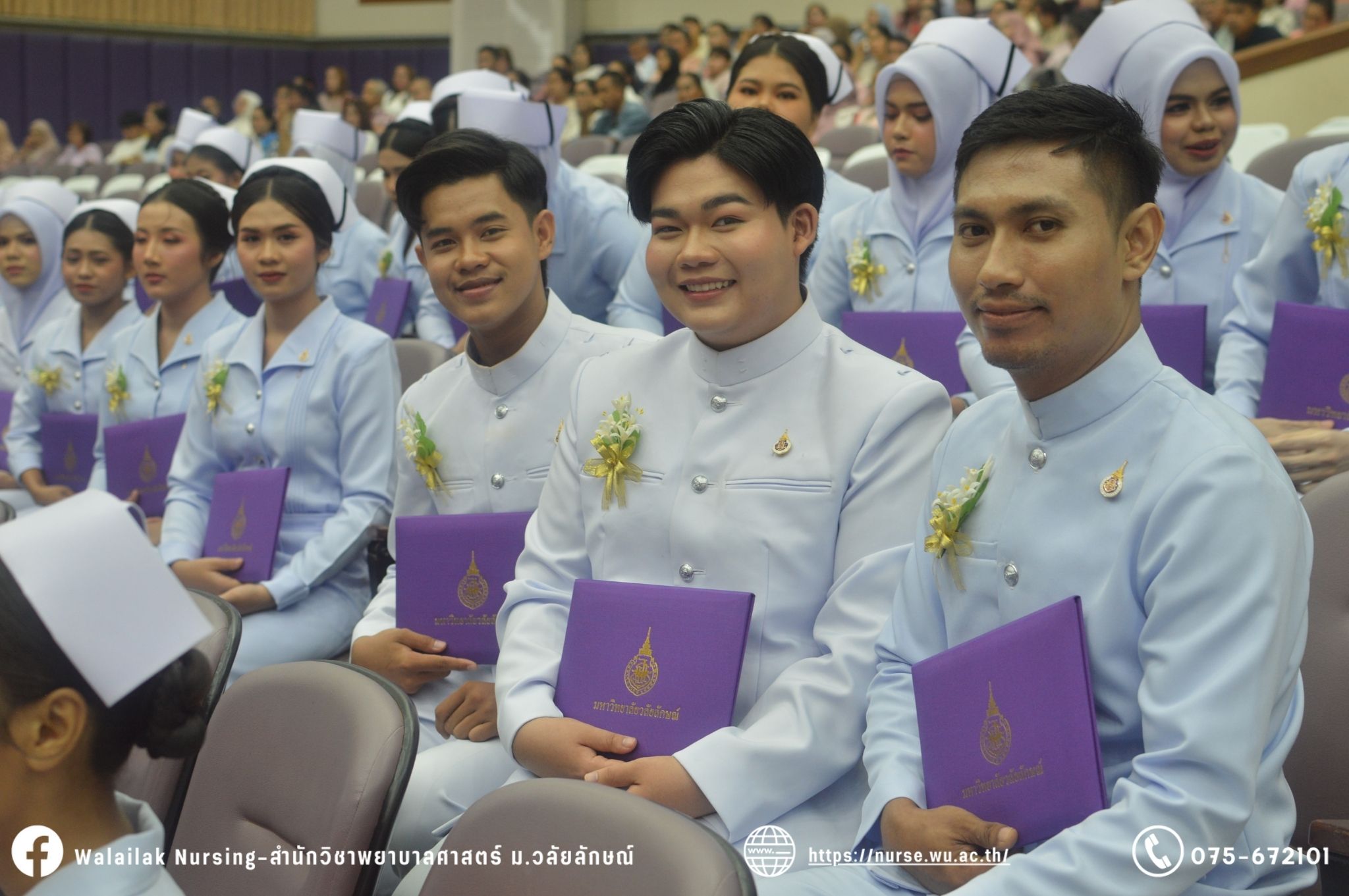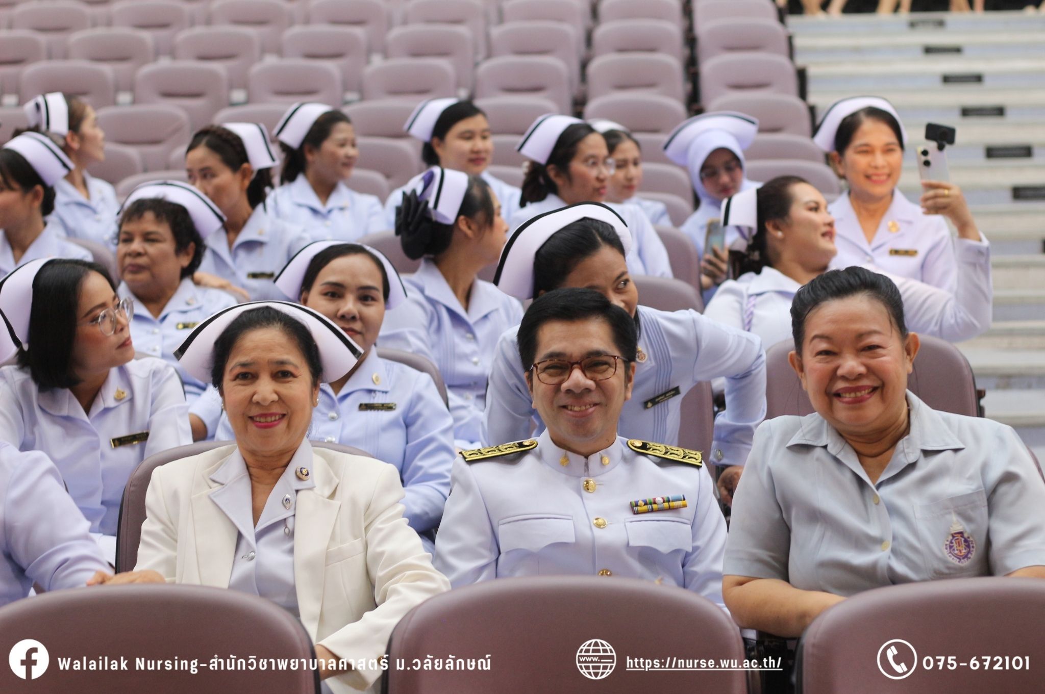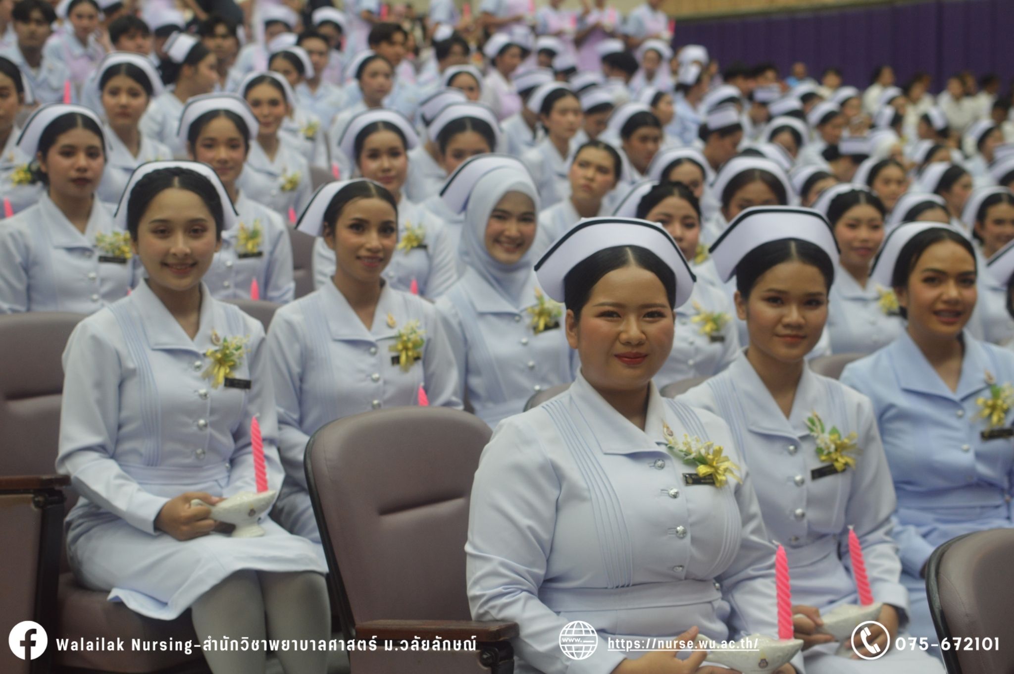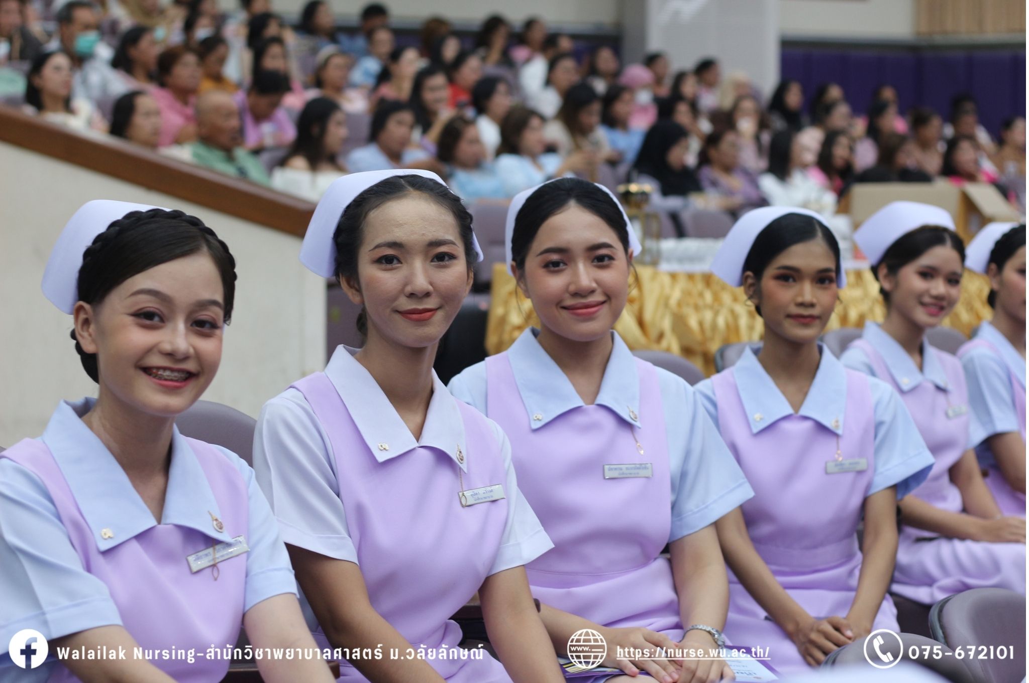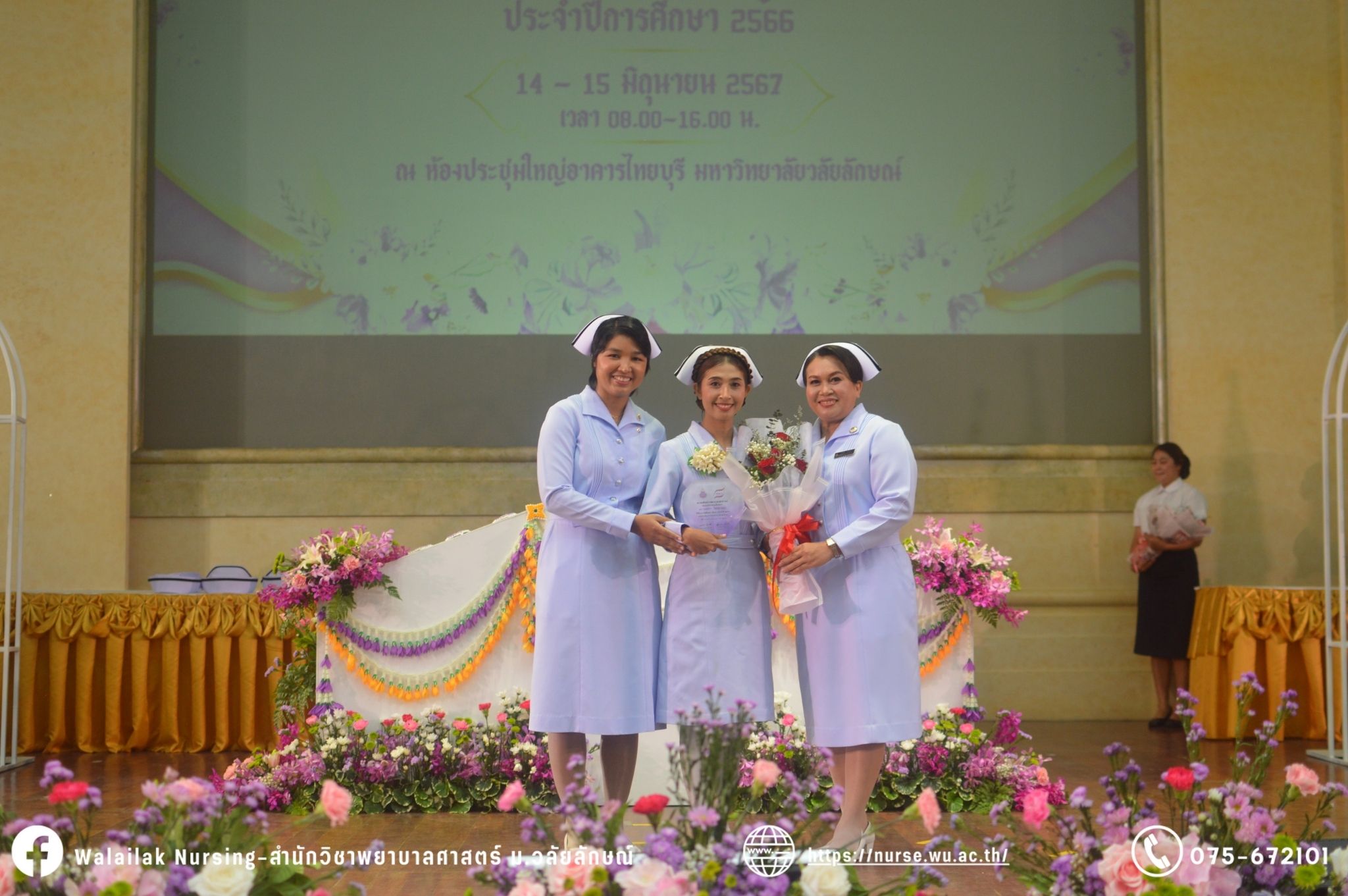 เมื่อวันที่ 15 มิถุนายน 2567 สำนักวิชาพยาบาลศาสตร์ มหาวิทยาลัยวลัยลักษณ์ จัดพิธี มอบขีด หมวกพยาบาล เข็มสถาบัน และพิธีมอบประกาศนียบัตรผู้ช่วยพยาบาล ณ หอประชุมใหญ่ อาคารไทยบุรี โดยกิจกรรมในครั้งนี้ ผู้ช่วยศาสตราจารย์ ดร.อรเพ็ญ สุขะวัลลิ คณบดีสำนักวิชาพยาบาลศาสตร์เป็นประธานในพิธี อาจารย์สุดา ใจห้าว รองคณบดีสำนักวิชาพยาบาลศาสตร์ กล่าวรายงานโครงการ และกิจกรรมในครั้งนี้ได้รับเกียรติจาก ศาสตราจารย์ ดร.สมบัติ ธำรงธัญวงศ์ อธิการบดี มหาวิทยาลัยวลัยลักษณ์ ได้เข้าร่วมพิธี กล่าวต้อนรับผู้ปกครองและให้โอวาท แสดงความยินดีกับผู้สำเร็จการศึกษา นักศึกษาที่ได้รับหมวก ขีดหมวก เข็มสถาบัน และผู้ได้รับรางวัล สำหรับการจัดกิจกรรมในครั้งนี้ได้จัดขึ้นเพื่อแสดงความยินดีให้กับบัณฑิตหลักสูตรพยาบาลศาสตรบัณฑิต ที่สำเร็จการศึกษา นักศึกษาพยาบาลชั้นปีที่ 3 มหาบัณฑิต หลักสูตรพยาบาลศาสตรมหาบัณฑิต ผู้สำเร็จการศึกษาหลักสูตรประกาศนียบัตรผู้ช่วยพยาบาล และผู้ได้รับรางวัลและเกียรติบัตรในการเป็นตัวอย่างที่ดีทั้งด้านการเรียนการปฏิบัติงาน จิตอาสา และบำเพ็ญประโยชน์เพื่อส่วนรวม รวมถึงผู้ได้รับรางวัลศิษย์เก่าดีเด่น จากสมาคมศิษย์เก่าพยาบาลวลัยลักษณ์ ทั้งนี้เพื่อเป็นการสร้างสัมพันธภาพที่ดีระหว่างรุ่นพี่ รุ่นน้อง และสร้างเจตคติที่ดีต่อวิชาชีพ พร้อมเข้าสู่วิชาชีพพยาบาลทั้งในด้านวิชาการ วิชาชีพ