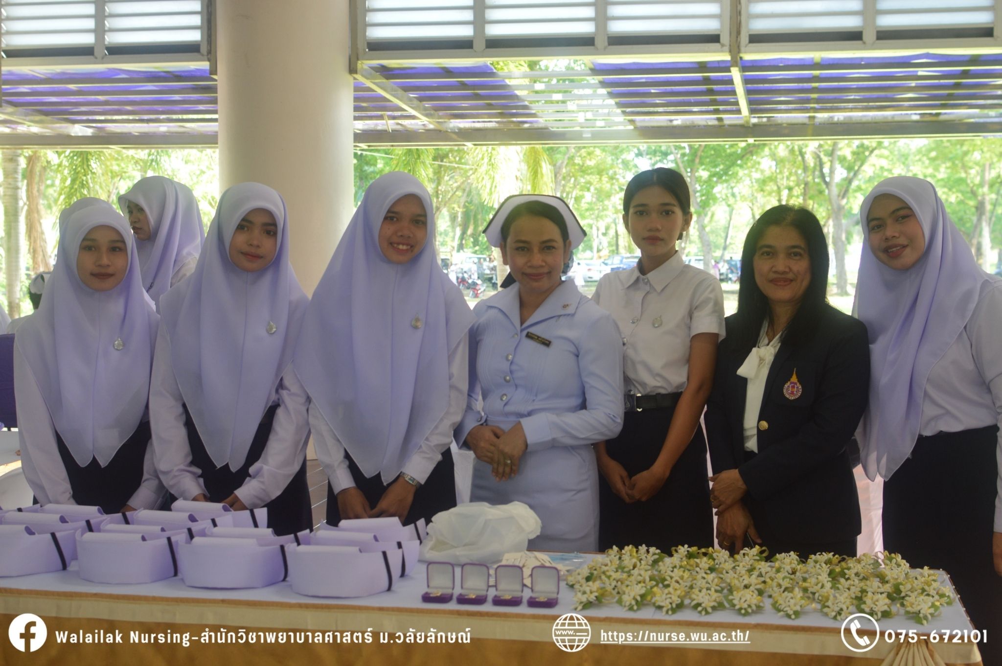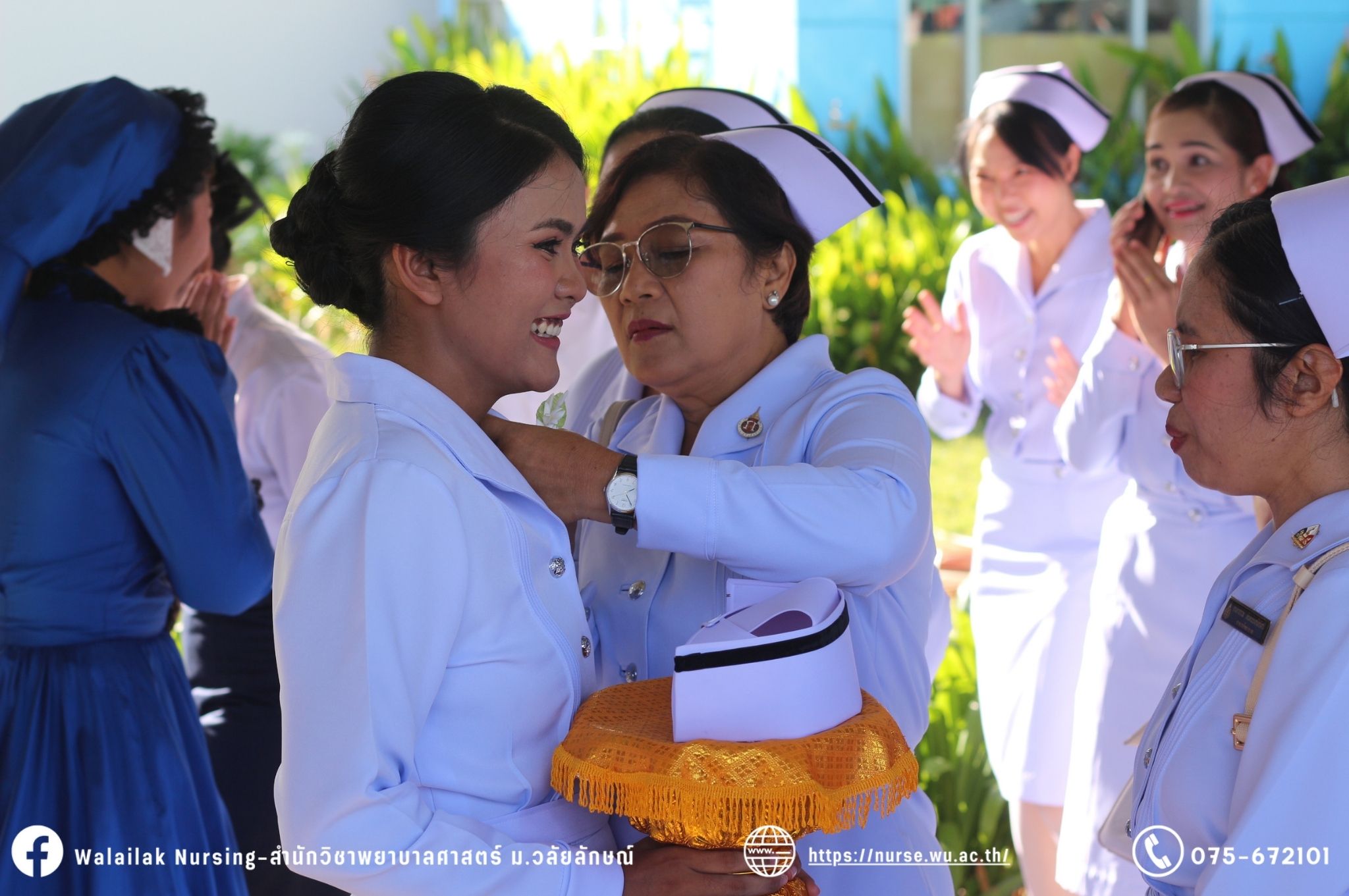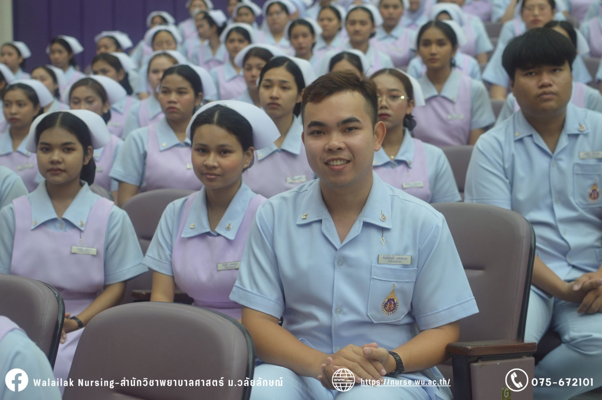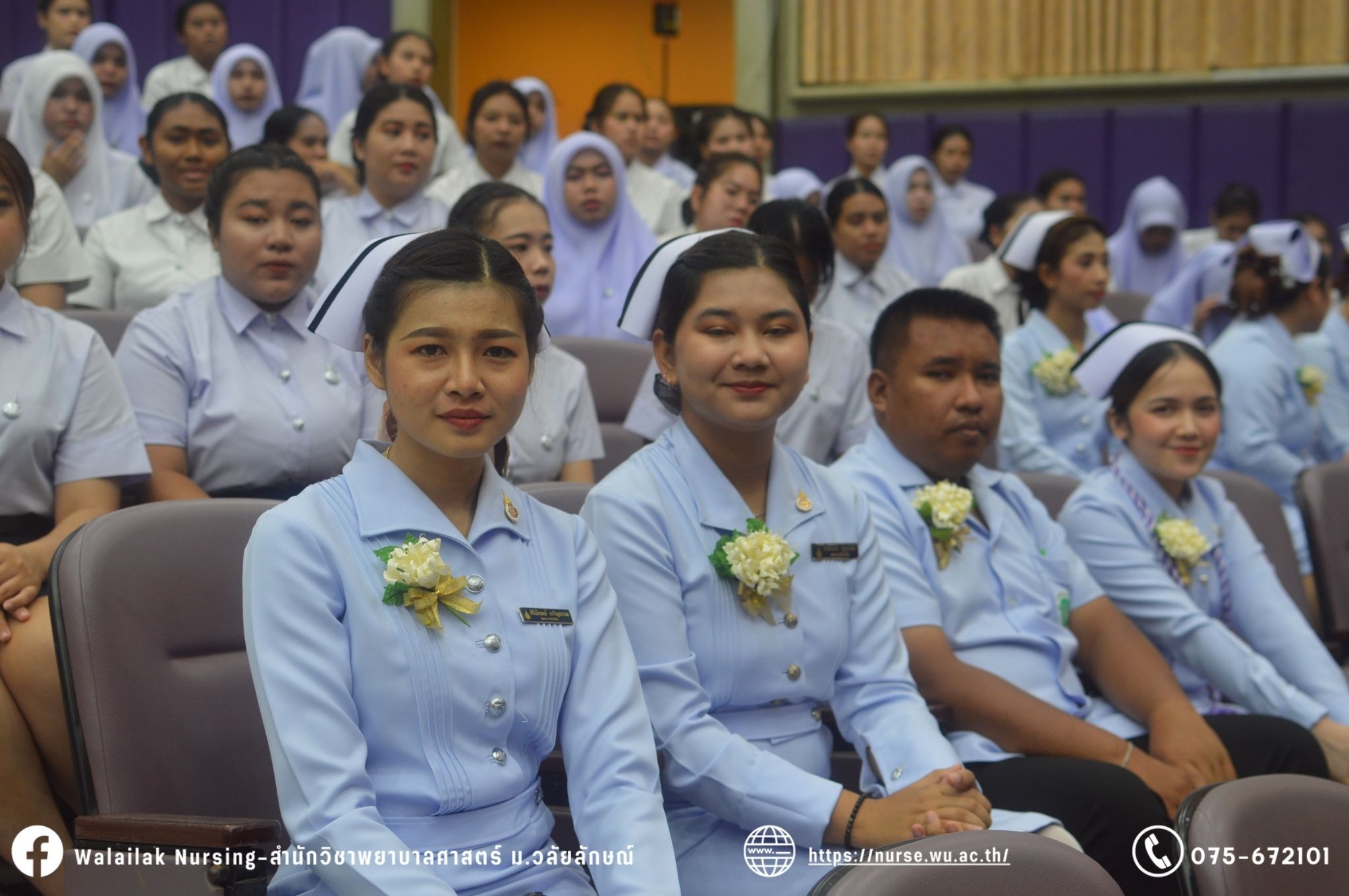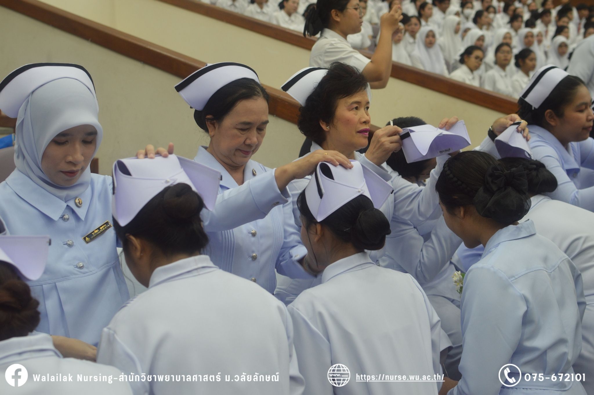 เมื่อวันที่ 15 มิถุนายน 2567 สำนักวิชาพยาบาลศาสตร์ มหาวิทยาลัยวลัยลักษณ์ จัดพิธี มอบขีด หมวกพยาบาล เข็มสถาบัน และพิธีมอบประกาศนียบัตรผู้ช่วยพยาบาล ณ หอประชุมใหญ่ อาคารไทยบุรี โดยกิจกรรมในครั้งนี้ ผู้ช่วยศาสตราจารย์ ดร.อรเพ็ญ สุขะวัลลิ คณบดีสำนักวิชาพยาบาลศาสตร์เป็นประธานในพิธี อาจารย์สุดา ใจห้าว รองคณบดีสำนักวิชาพยาบาลศาสตร์ กล่าวรายงานโครงการ และกิจกรรมในครั้งนี้ได้รับเกียรติจาก ศาสตราจารย์ ดร.สมบัติ ธำรงธัญวงศ์ อธิการบดี มหาวิทยาลัยวลัยลักษณ์ ได้เข้าร่วมพิธี กล่าวต้อนรับผู้ปกครองและให้โอวาท แสดงความยินดีกับผู้สำเร็จการศึกษา นักศึกษาที่ได้รับหมวก ขีดหมวก เข็มสถาบัน และผู้ได้รับรางวัล สำหรับการจัดกิจกรรมในครั้งนี้ได้จัดขึ้นเพื่อแสดงความยินดีให้กับบัณฑิตหลักสูตรพยาบาลศาสตรบัณฑิต ที่สำเร็จการศึกษา นักศึกษาพยาบาลชั้นปีที่ 3 มหาบัณฑิต หลักสูตรพยาบาลศาสตรมหาบัณฑิต ผู้สำเร็จการศึกษาหลักสูตรประกาศนียบัตรผู้ช่วยพยาบาล และผู้ได้รับรางวัลและเกียรติบัตรในการเป็นตัวอย่างที่ดีทั้งด้านการเรียนการปฏิบัติงาน จิตอาสา และบำเพ็ญประโยชน์เพื่อส่วนรวม รวมถึงผู้ได้รับรางวัลศิษย์เก่าดีเด่น จากสมาคมศิษย์เก่าพยาบาลวลัยลักษณ์ ทั้งนี้เพื่อเป็นการสร้างสัมพันธภาพที่ดีระหว่างรุ่นพี่ รุ่นน้อง และสร้างเจตคติที่ดีต่อวิชาชีพ พร้อมเข้าสู่วิชาชีพพยาบาลทั้งในด้านวิชาการ วิชาชีพ