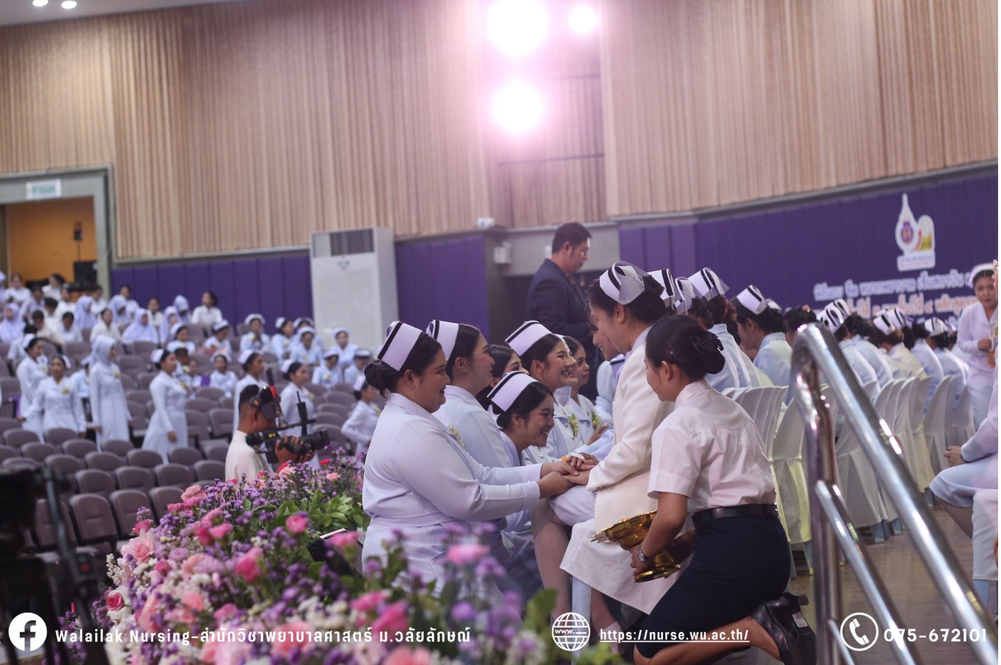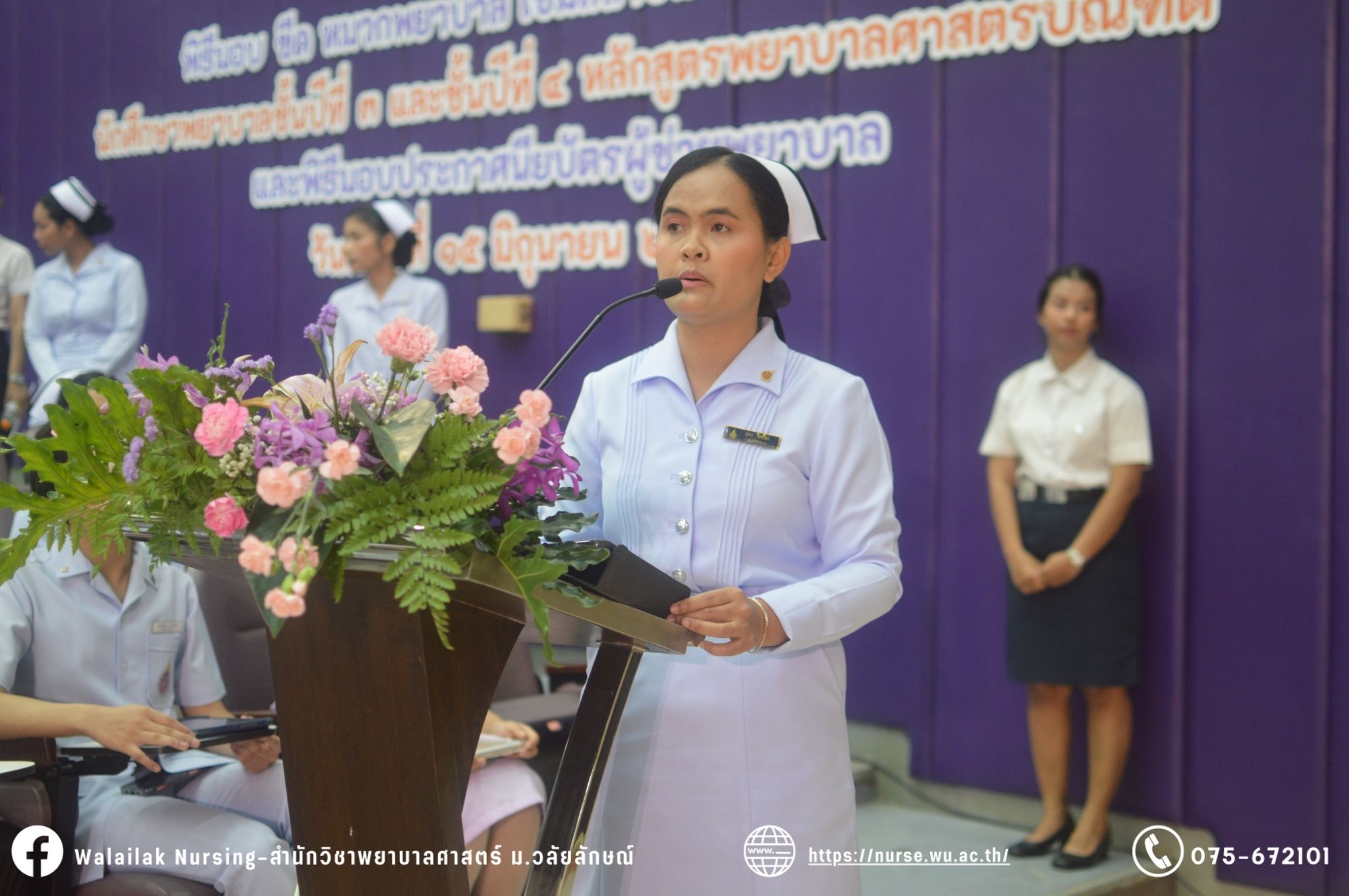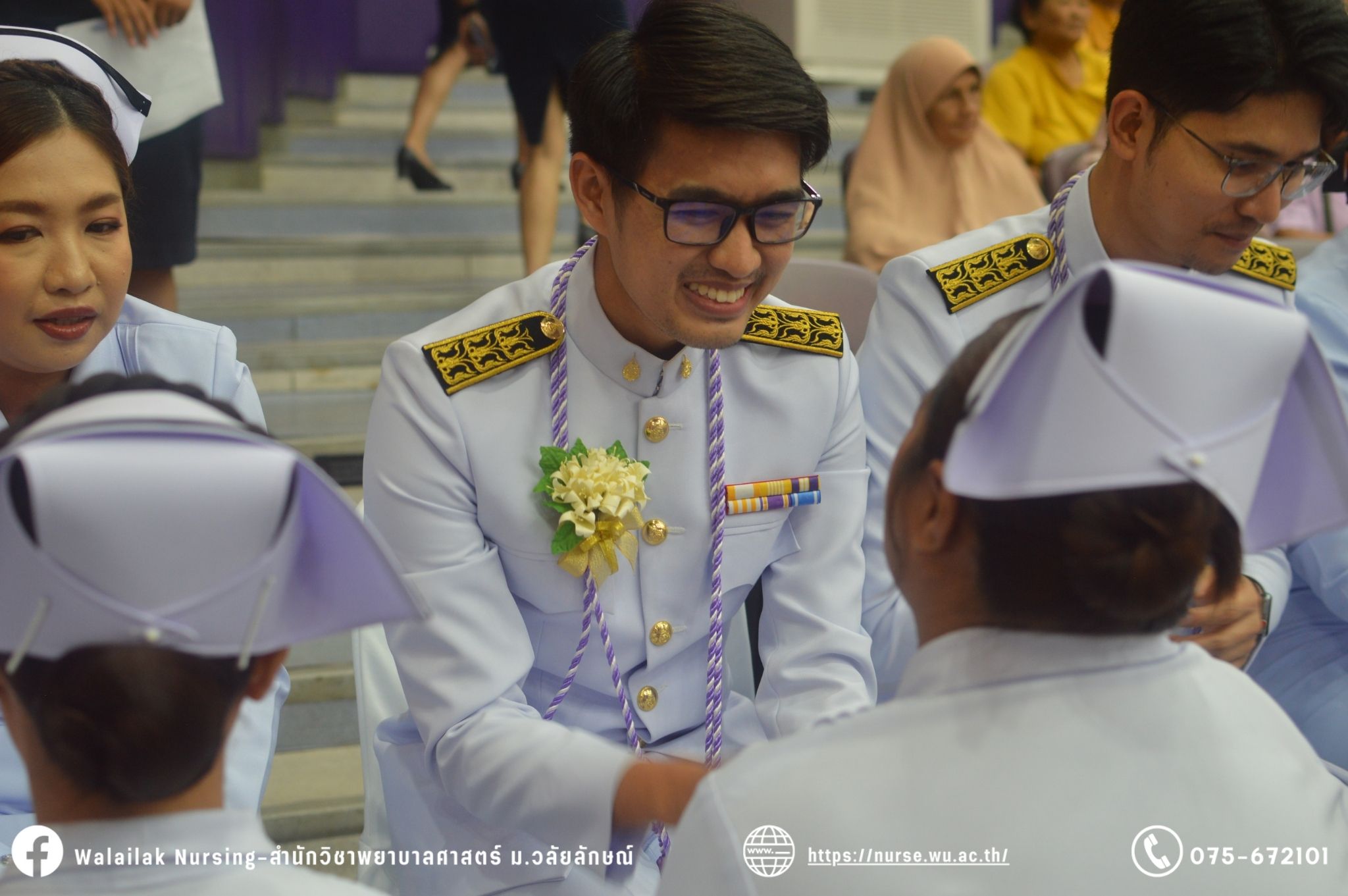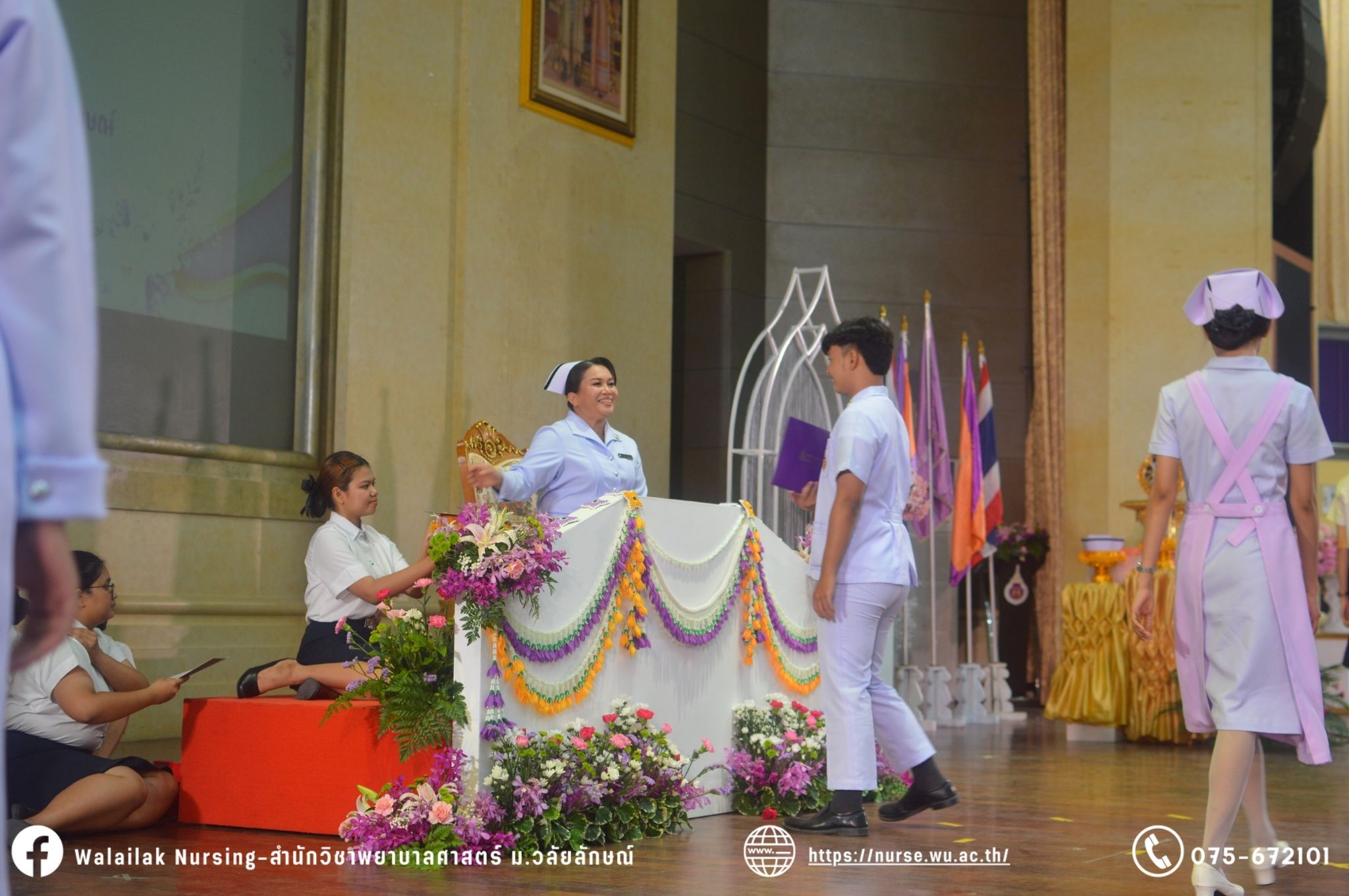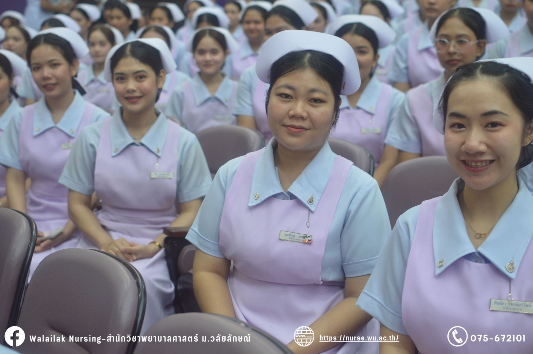 เมื่อวันที่ 15 มิถุนายน 2567 สำนักวิชาพยาบาลศาสตร์ มหาวิทยาลัยวลัยลักษณ์ จัดพิธี มอบขีด หมวกพยาบาล เข็มสถาบัน และพิธีมอบประกาศนียบัตรผู้ช่วยพยาบาล ณ หอประชุมใหญ่ อาคารไทยบุรี โดยกิจกรรมในครั้งนี้ ผู้ช่วยศาสตราจารย์ ดร.อรเพ็ญ สุขะวัลลิ คณบดีสำนักวิชาพยาบาลศาสตร์เป็นประธานในพิธี อาจารย์สุดา ใจห้าว รองคณบดีสำนักวิชาพยาบาลศาสตร์ กล่าวรายงานโครงการ และกิจกรรมในครั้งนี้ได้รับเกียรติจาก ศาสตราจารย์ ดร.สมบัติ ธำรงธัญวงศ์ อธิการบดี มหาวิทยาลัยวลัยลักษณ์ ได้เข้าร่วมพิธี กล่าวต้อนรับผู้ปกครองและให้โอวาท แสดงความยินดีกับผู้สำเร็จการศึกษา นักศึกษาที่ได้รับหมวก ขีดหมวก เข็มสถาบัน และผู้ได้รับรางวัล สำหรับการจัดกิจกรรมในครั้งนี้ได้จัดขึ้นเพื่อแสดงความยินดีให้กับบัณฑิตหลักสูตรพยาบาลศาสตรบัณฑิต ที่สำเร็จการศึกษา นักศึกษาพยาบาลชั้นปีที่ 3 มหาบัณฑิต หลักสูตรพยาบาลศาสตรมหาบัณฑิต ผู้สำเร็จการศึกษาหลักสูตรประกาศนียบัตรผู้ช่วยพยาบาล และผู้ได้รับรางวัลและเกียรติบัตรในการเป็นตัวอย่างที่ดีทั้งด้านการเรียนการปฏิบัติงาน จิตอาสา และบำเพ็ญประโยชน์เพื่อส่วนรวม รวมถึงผู้ได้รับรางวัลศิษย์เก่าดีเด่น จากสมาคมศิษย์เก่าพยาบาลวลัยลักษณ์ ทั้งนี้เพื่อเป็นการสร้างสัมพันธภาพที่ดีระหว่างรุ่นพี่ รุ่นน้อง และสร้างเจตคติที่ดีต่อวิชาชีพ พร้อมเข้าสู่วิชาชีพพยาบาลทั้งในด้านวิชาการ วิชาชีพ
