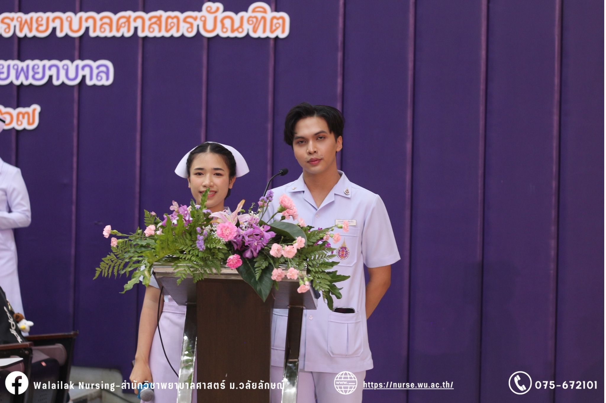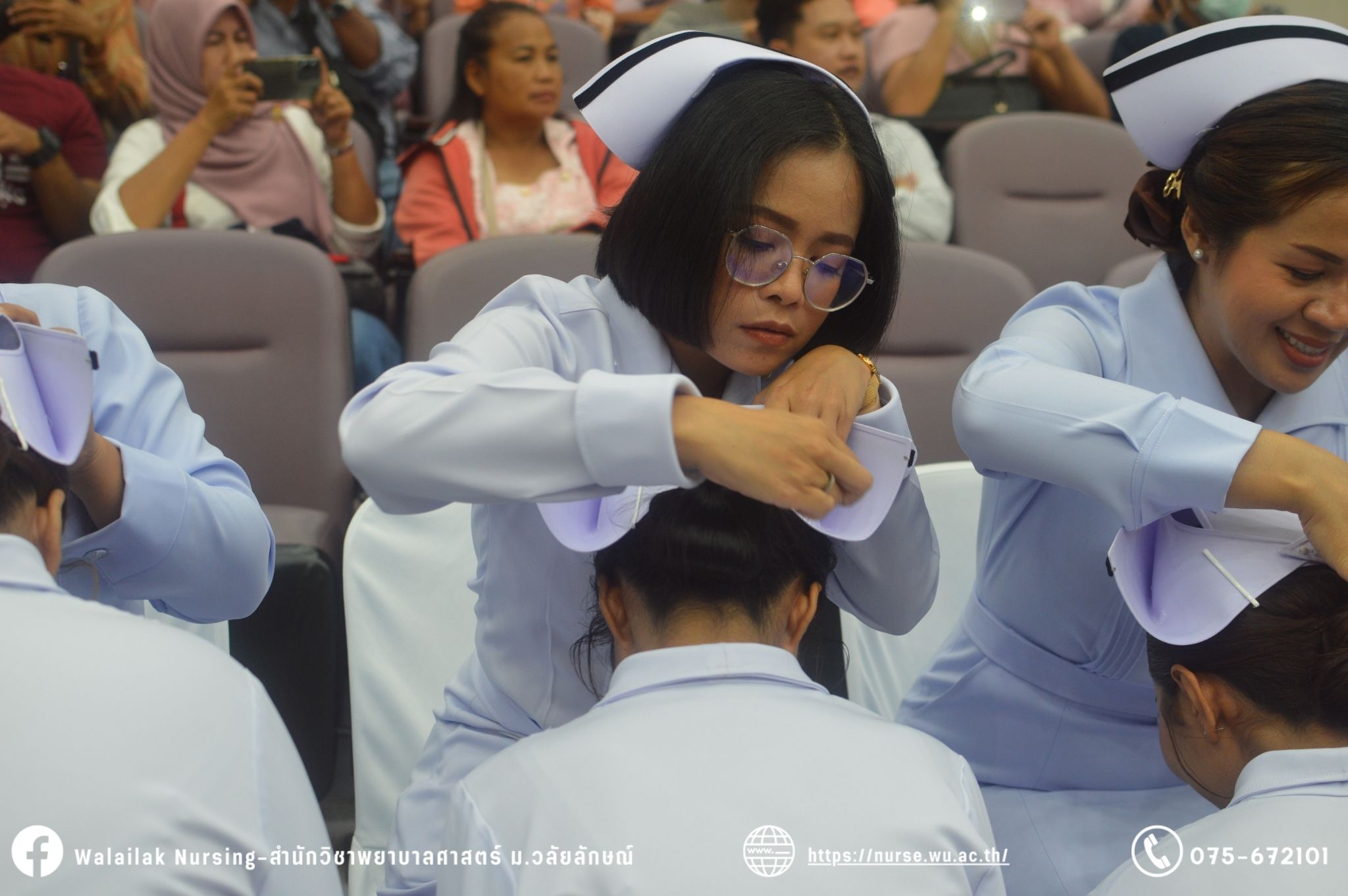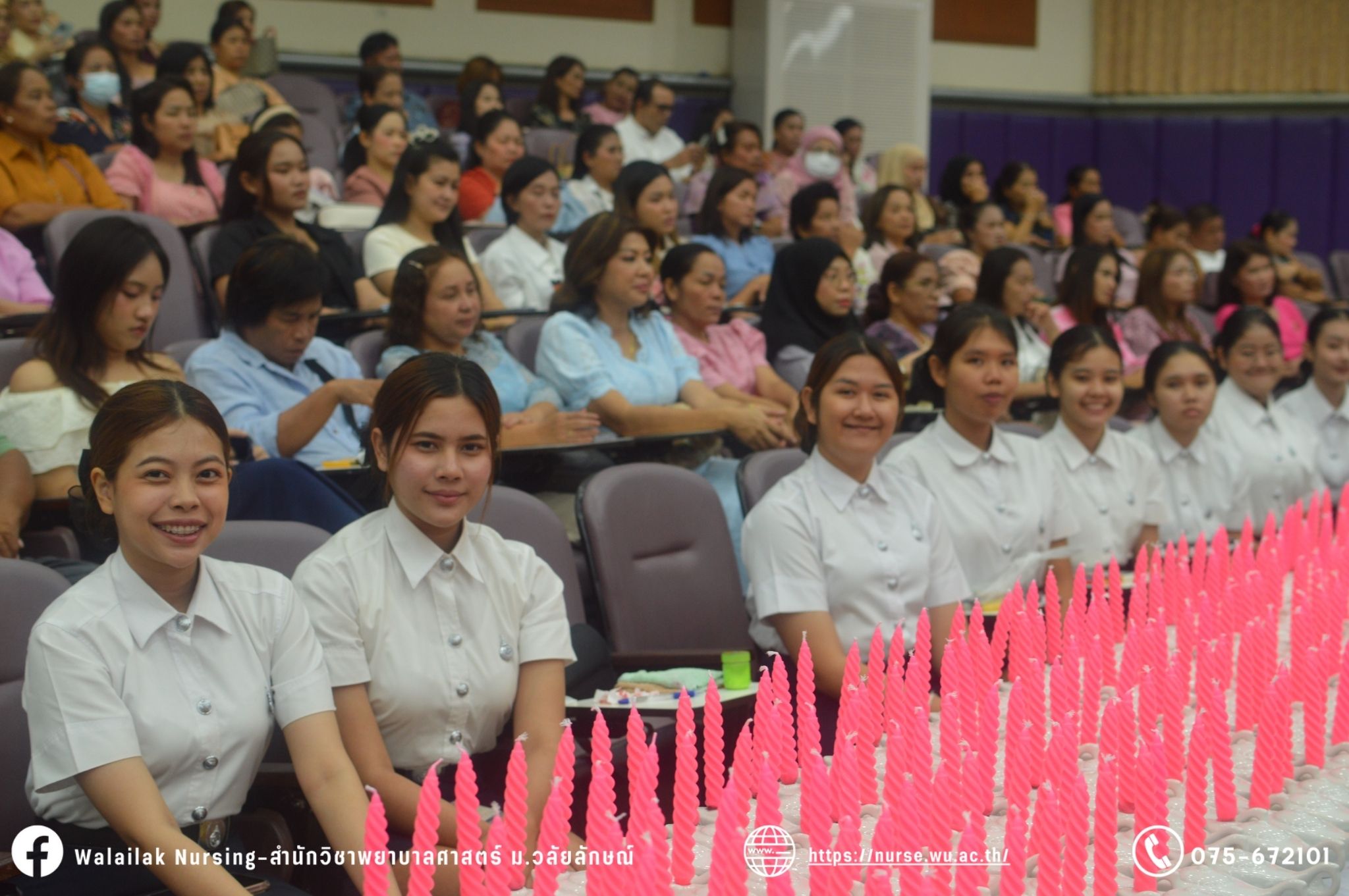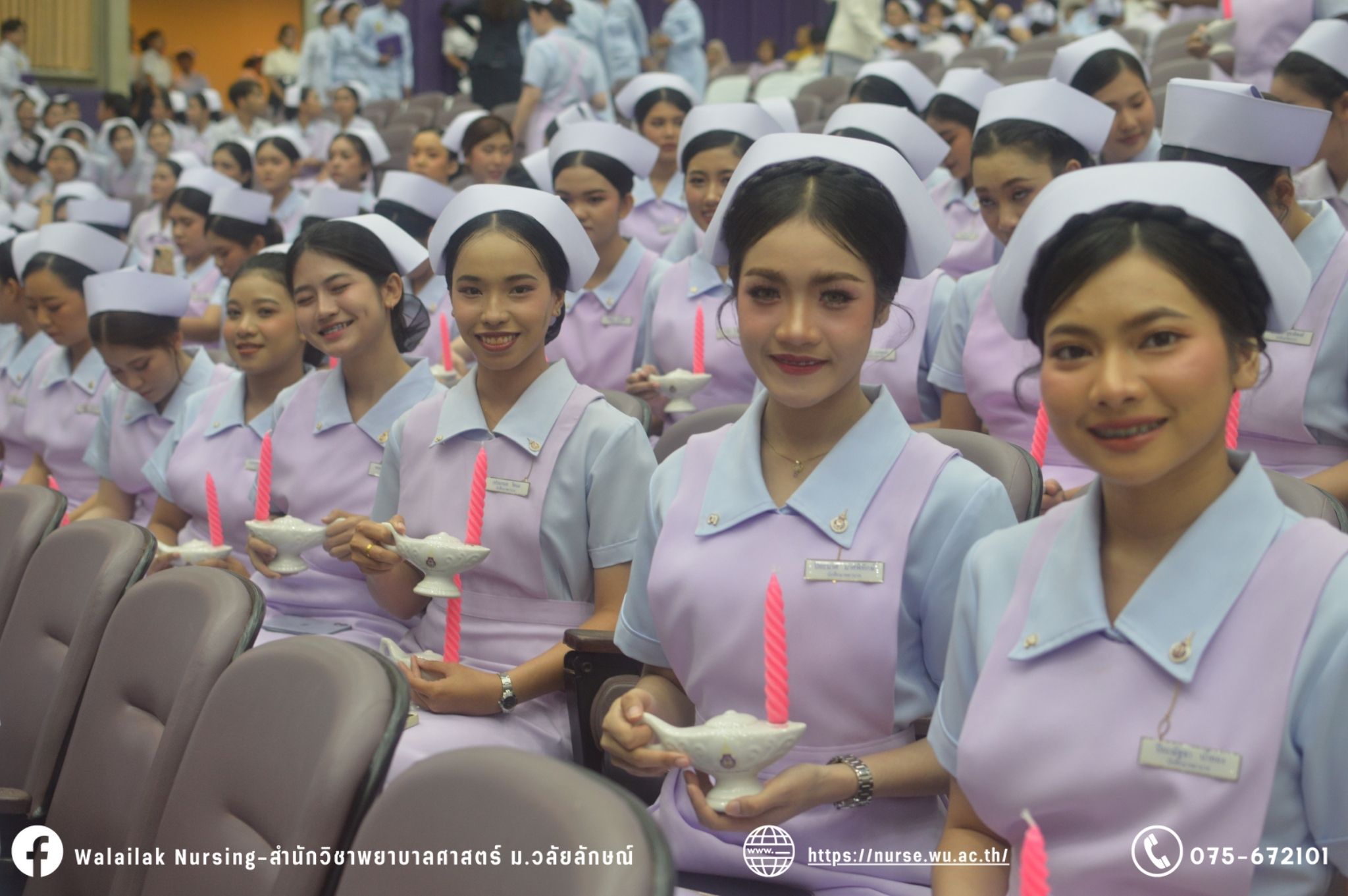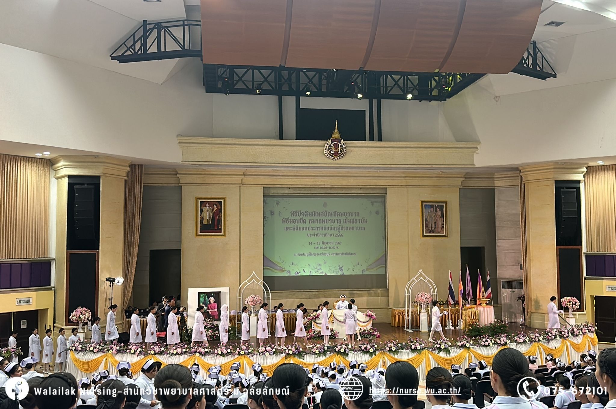 เมื่อวันที่ 15 มิถุนายน 2567 สำนักวิชาพยาบาลศาสตร์ มหาวิทยาลัยวลัยลักษณ์ จัดพิธี มอบขีด หมวกพยาบาล เข็มสถาบัน และพิธีมอบประกาศนียบัตรผู้ช่วยพยาบาล ณ หอประชุมใหญ่ อาคารไทยบุรี โดยกิจกรรมในครั้งนี้ ผู้ช่วยศาสตราจารย์ ดร.อรเพ็ญ สุขะวัลลิ คณบดีสำนักวิชาพยาบาลศาสตร์เป็นประธานในพิธี อาจารย์สุดา ใจห้าว รองคณบดีสำนักวิชาพยาบาลศาสตร์ กล่าวรายงานโครงการ และกิจกรรมในครั้งนี้ได้รับเกียรติจาก ศาสตราจารย์ ดร.สมบัติ ธำรงธัญวงศ์ อธิการบดี มหาวิทยาลัยวลัยลักษณ์ ได้เข้าร่วมพิธี กล่าวต้อนรับผู้ปกครองและให้โอวาท แสดงความยินดีกับผู้สำเร็จการศึกษา นักศึกษาที่ได้รับหมวก ขีดหมวก เข็มสถาบัน และผู้ได้รับรางวัล สำหรับการจัดกิจกรรมในครั้งนี้ได้จัดขึ้นเพื่อแสดงความยินดีให้กับบัณฑิตหลักสูตรพยาบาลศาสตรบัณฑิต ที่สำเร็จการศึกษา นักศึกษาพยาบาลชั้นปีที่ 3 มหาบัณฑิต หลักสูตรพยาบาลศาสตรมหาบัณฑิต ผู้สำเร็จการศึกษาหลักสูตรประกาศนียบัตรผู้ช่วยพยาบาล และผู้ได้รับรางวัลและเกียรติบัตรในการเป็นตัวอย่างที่ดีทั้งด้านการเรียนการปฏิบัติงาน จิตอาสา และบำเพ็ญประโยชน์เพื่อส่วนรวม รวมถึงผู้ได้รับรางวัลศิษย์เก่าดีเด่น จากสมาคมศิษย์เก่าพยาบาลวลัยลักษณ์ ทั้งนี้เพื่อเป็นการสร้างสัมพันธภาพที่ดีระหว่างรุ่นพี่ รุ่นน้อง และสร้างเจตคติที่ดีต่อวิชาชีพ พร้อมเข้าสู่วิชาชีพพยาบาลทั้งในด้านวิชาการ วิชาชีพ