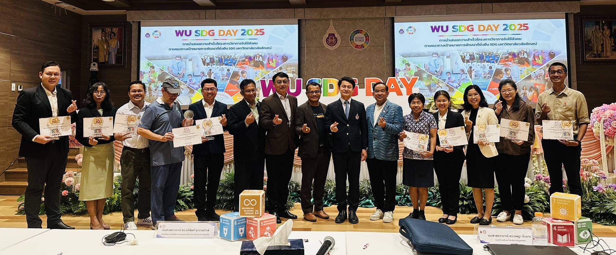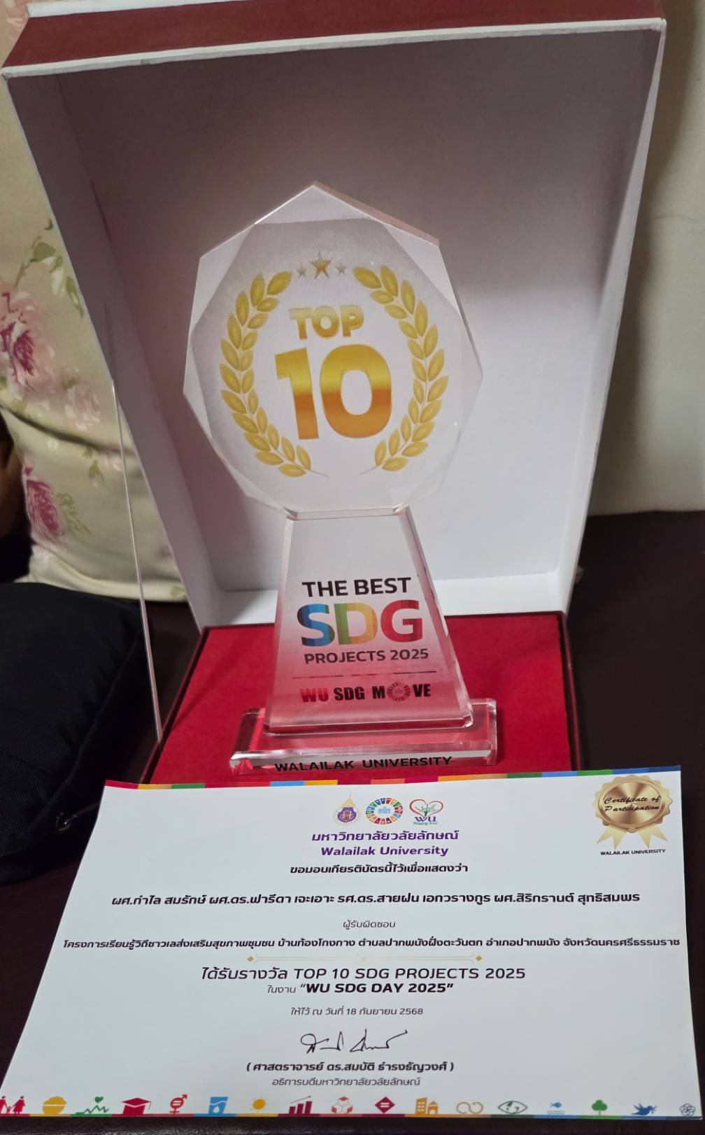 เมื่อวันที่ 18 กันยายน 2568 อาจารย์สำนักวิชาพยาบาลศาสตร์ โดย ผู้ช่วยศาสตราจารย์กำไล สมรักษ์ ได้ร่ววมกิจกรรมงาน WU SDG DAY และร่วมนำเสนอผลงานโครงการบริการวิชาการรับใช้สังคม และได้รับรางวัล SDG เด่น TOP 10 SDG PROJECTS ประจำปี 2025 โดยอาจารย์ได้จัดทำโครงการ “เรียนรู้วิถีชาวเลส่งเสริมสุขภาพชุมชน บ้านท้องโกงกาง ตำบลปากพนังฝั่งตะวันตก อำเภอปากพนัง จังหวัดนครศรีธรรมราช” ซึ่งโครงการนี้ได้มี รองศาสตราจารย์ ดร.สายฝน เอกวรางกูร, ผู้ช่วยศาสตราจารย์สิริกรานต์ สุทธิสมพร และผู้ช่วยศาสตราจารย์ ดร.ฟารีดา เจะเอาะ จากสำนักวิชาสารสนเทศศาสตร์ ร่วมดำเนินการ