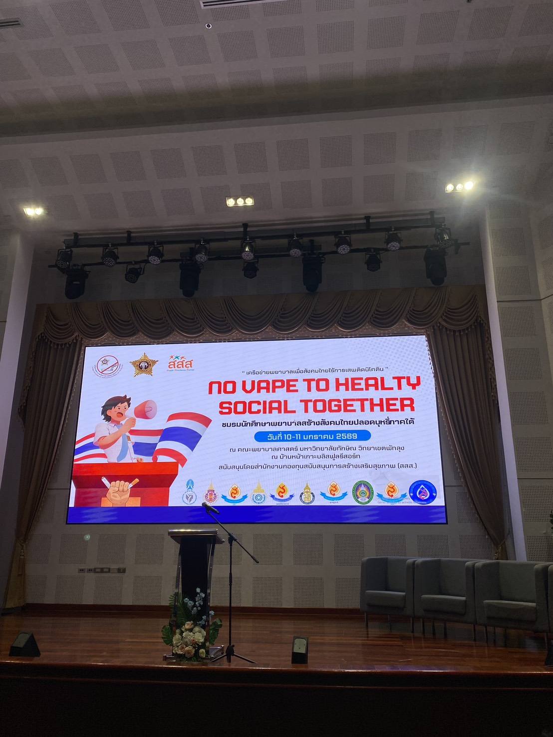 “เครือข่ายพยาบาลเพื่อสังคมไทยไร้การเสพติดนิโคติน” (NO VAPE TO HEALTHY SOCIAL TOGETHER) โดยความร่วมมือของ ชมรมนักศึกษาพยาบาลสร้างสังคมไทยปลอดบุหรี่ภาคใต้ระหว่างวันที่ 10–11 มกราคม 2569 กิจกรรมจัดขึ้น ณ คณะพยาบาลศาสตร์ มหาวิทยาลัยทักษิณ วิทยาเขตพัทลุง และบ้านหน้าเกาะบลิสฟูลรีสอร์ท จังหวัดพัทลุง โดยได้รับการสนับสนุนจาก สำนักงานกองทุนสนับสนุนการสร้างเสริมสุขภาพ (สสส.)