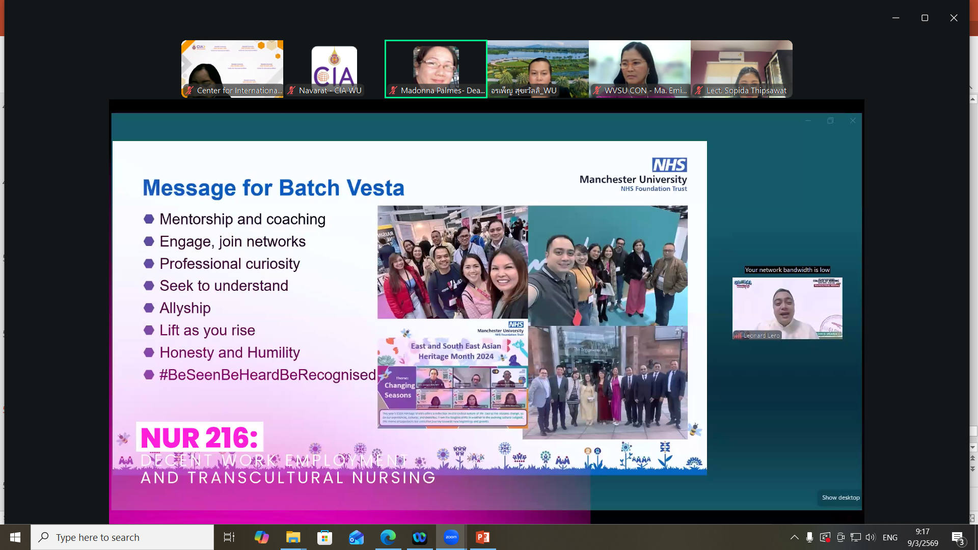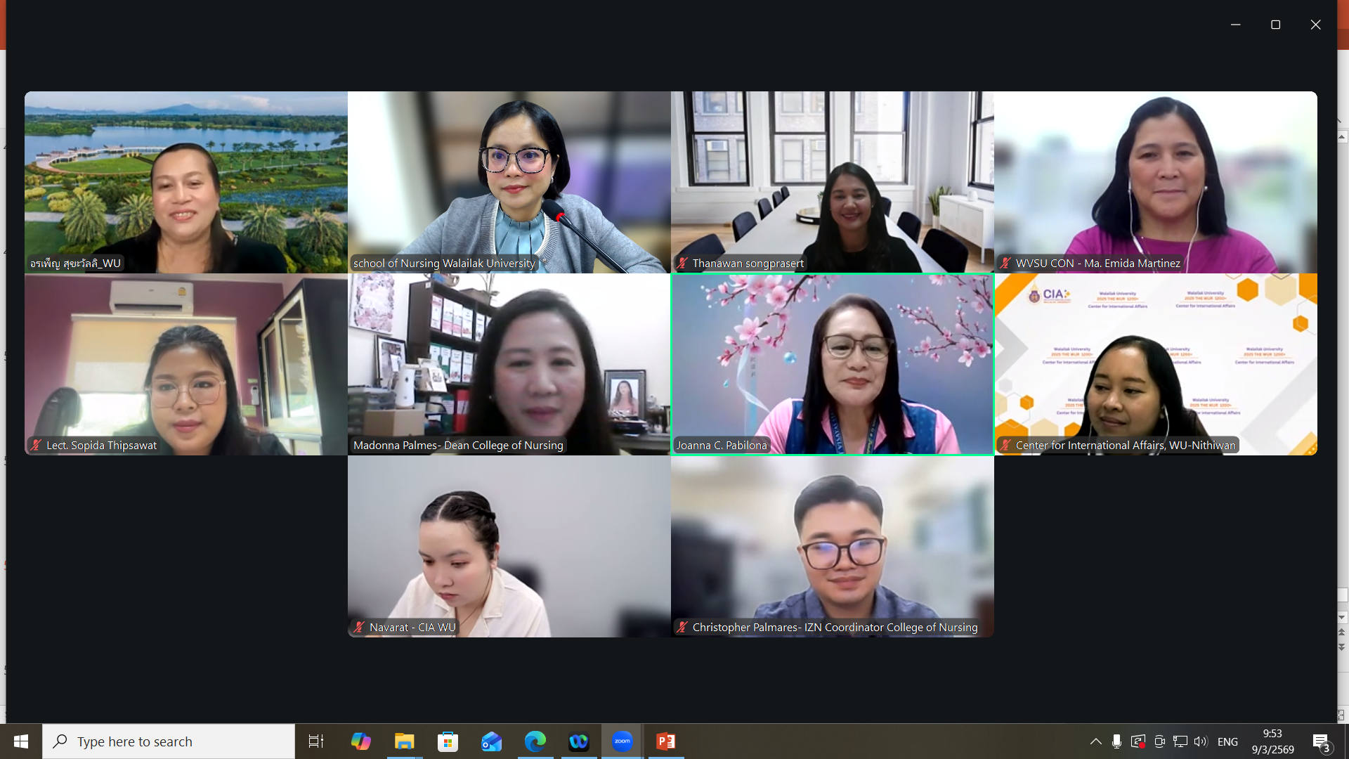 วันนี้ 9 มีนาคม 2569 สำนักวิชาพยาบาลศาสตร์ มหาวิทยาลัยวลัยลักษณ์ จัดการประชุมออนไลน์เพื่อหารือแนวทางความร่วมมือทางวิชาการกับ West Visayas State University (WVSU) ประเทศฟิลิปปินส์ โดยมี ผู้ช่วยศาสตราจารย์ ดร.อรเพ็ญ สุขะวัลลิ คณบดีสำนักวิชาพยาบาลศาสตร์ พร้อมด้วยคณาจารย์ของสำนักวิชา เข้าร่วมพูดคุยกับ Dr. Madonna S. Palmes คณบดีจาก West Visayas State University เพื่อแลกเปลี่ยนความคิดเห็นและวางแนวทางความร่วมมือทางวิชาการระหว่างสองสถาบันในอนาคต