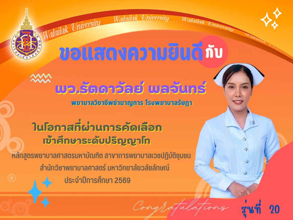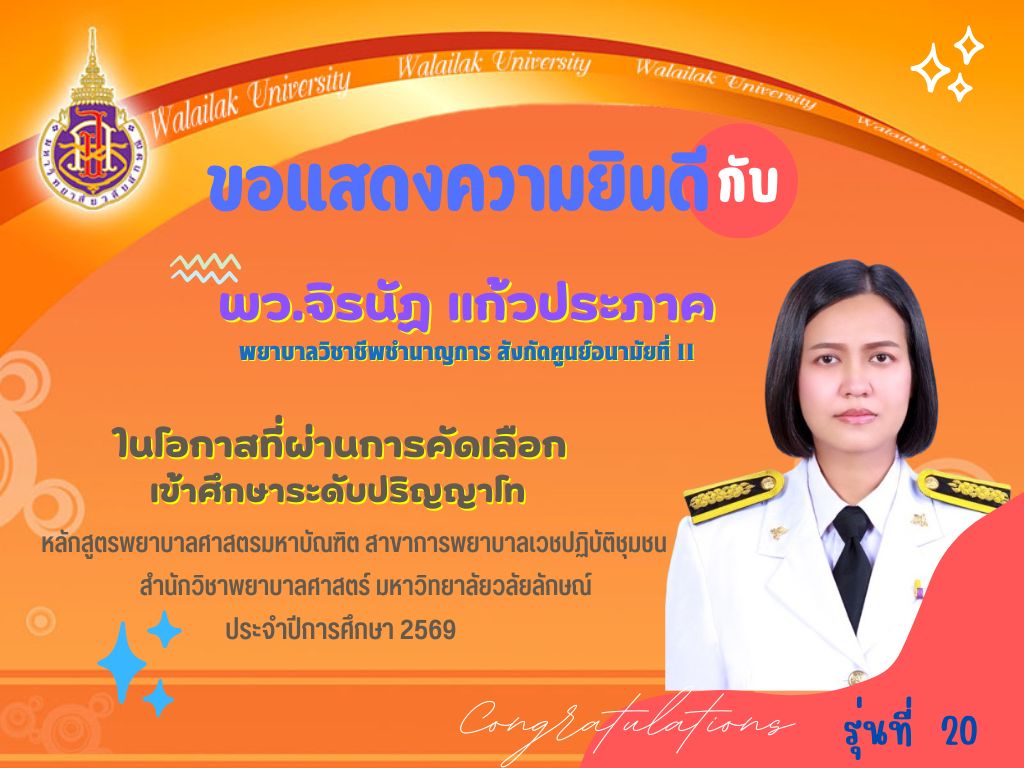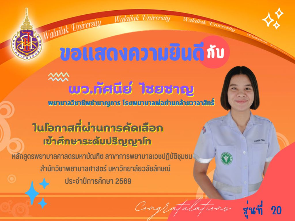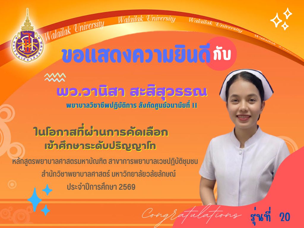 ขอแสดงความยินดีกับผู้ผ่านการคัดเลือกหลักสูตรพยาบาลศาสตรมหาบัณฑิต สาขาการพยาบาลเวชปฏิบัติชุมชน สำนักวิชาพยาบาลศาสตร์ มหาวิทยาลัยวลัยลักษณ์ ขอแสดงความยินดีกับผู้ผ่านการคัดเลือกหลักสูตรพยาบาลศาสตรบัณฑิต สาขาการพยาบาลเวชปฏิบัติชุมชน ประจำปีการศึกษา 2569