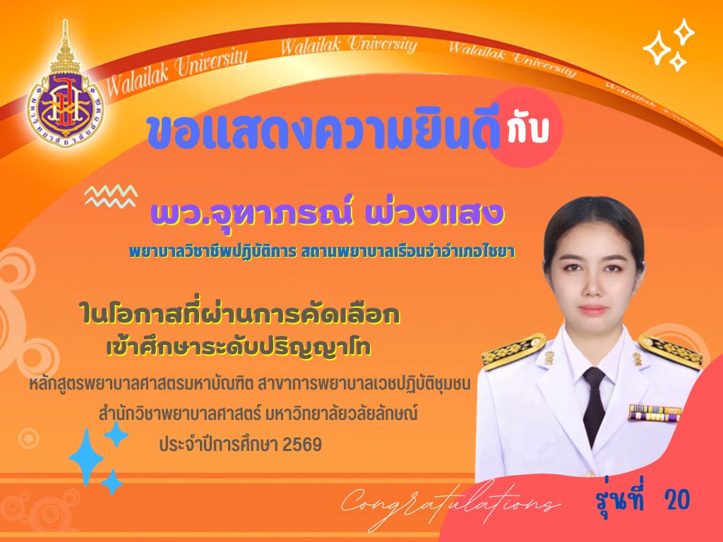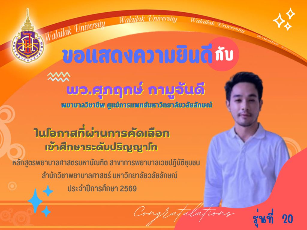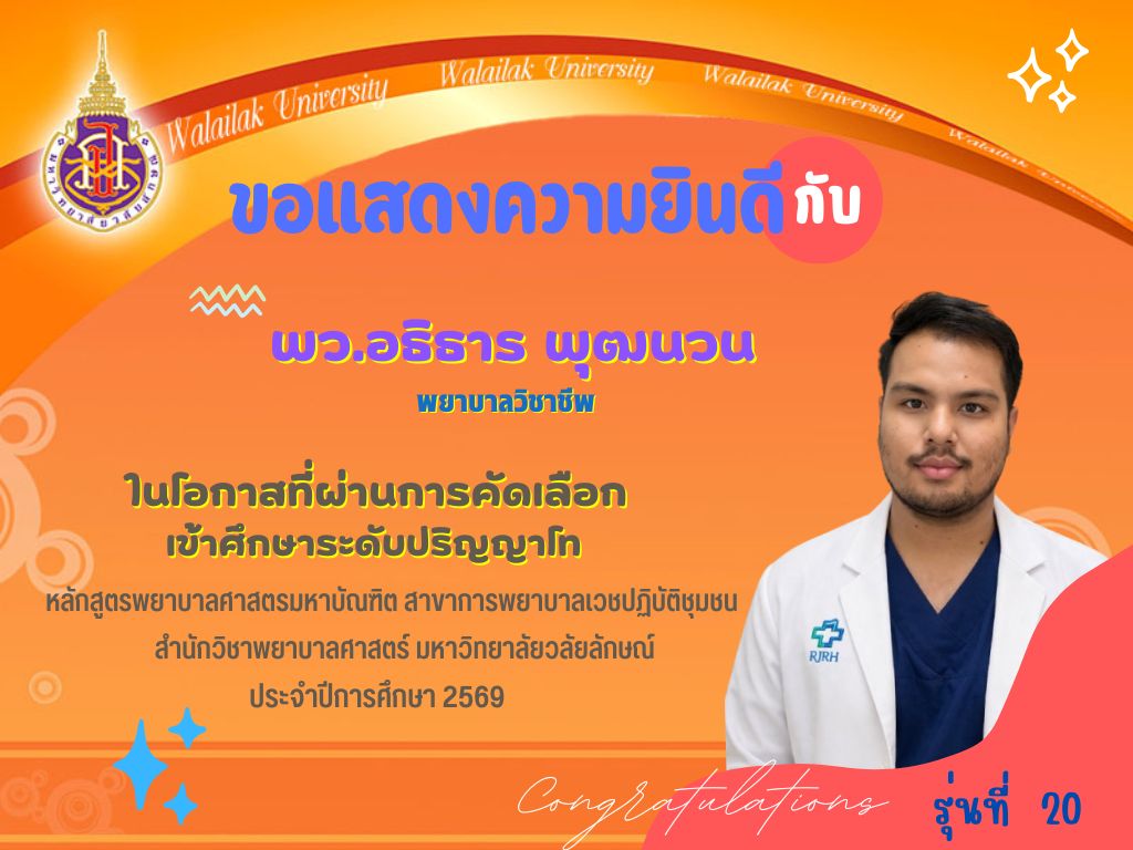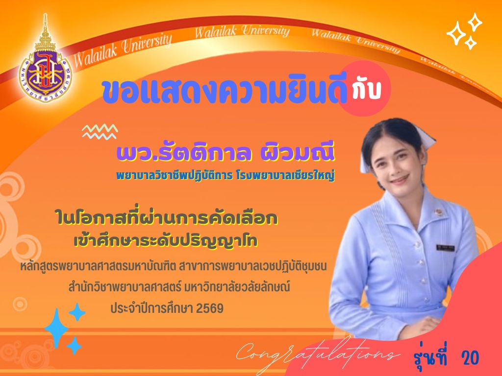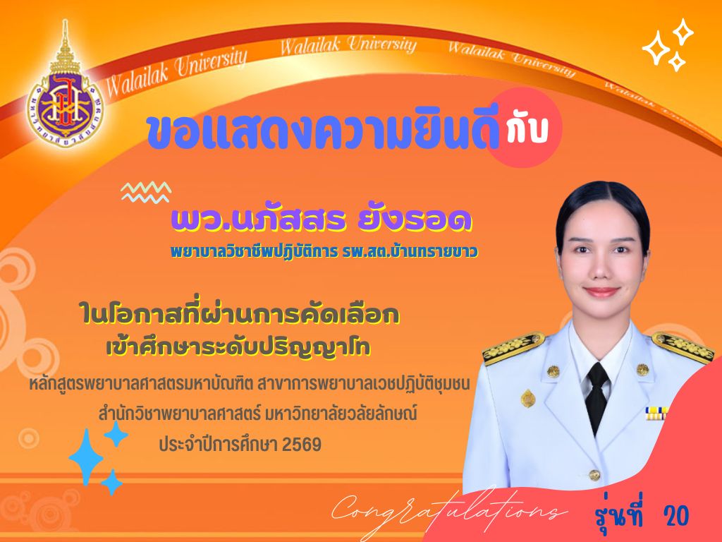 ขอแสดงความยินดีกับผู้ผ่านการคัดเลือกหลักสูตรพยาบาลศาสตรมหาบัณฑิต สาขาการพยาบาลเวชปฏิบัติชุมชน สำนักวิชาพยาบาลศาสตร์ มหาวิทยาลัยวลัยลักษณ์ ขอแสดงความยินดีกับผู้ผ่านการคัดเลือกหลักสูตรพยาบาลศาสตรบัณฑิต สาขาการพยาบาลเวชปฏิบัติชุมชน ประจำปีการศึกษา 2569