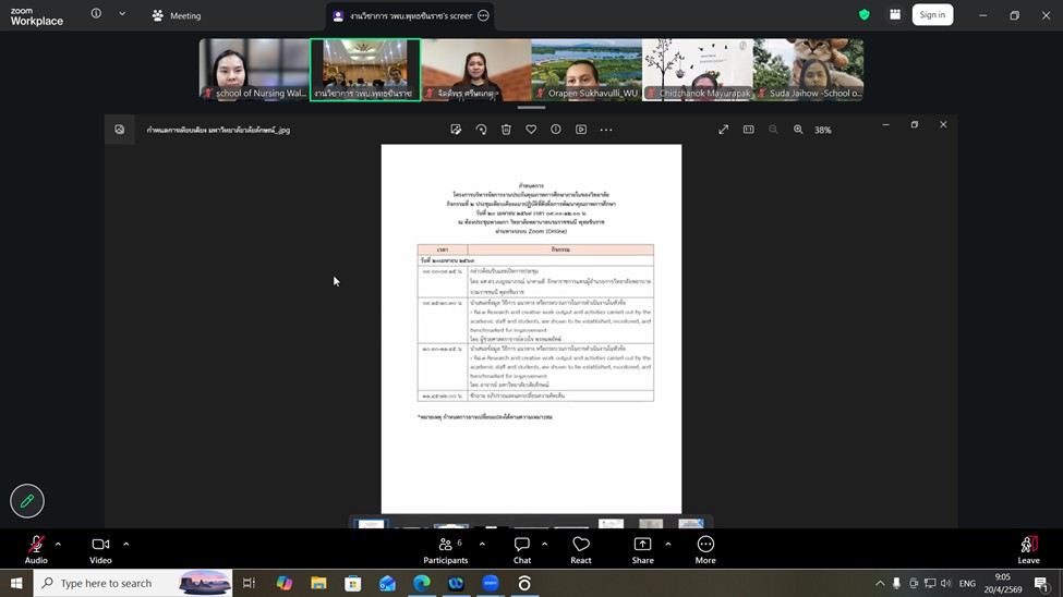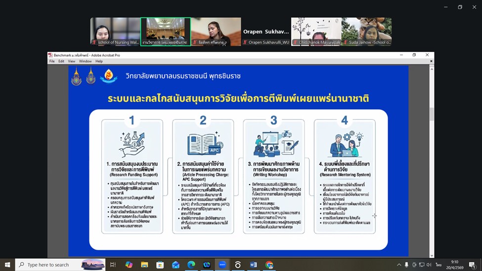วันนี้ 20 เมษายน 2569 สำนักวิชาพยาบาลศาสตร์ มหาวิทยาลัยวลัยลักษณ์ ได้ร่วมให้การแลกเปลี่ยนข้อมูลด้านการประกันคุณภาพการศึกษาในมิติของงานวิจัย Benchmarking ร่วมกับวิทยาลัยพยาบาลบรมราชชนนี พระพุทธชินราช เพื่อยกระดับมาตรฐานการดำเนินงานด้านวิชาการและการวิจัยสู่ระดับสากล